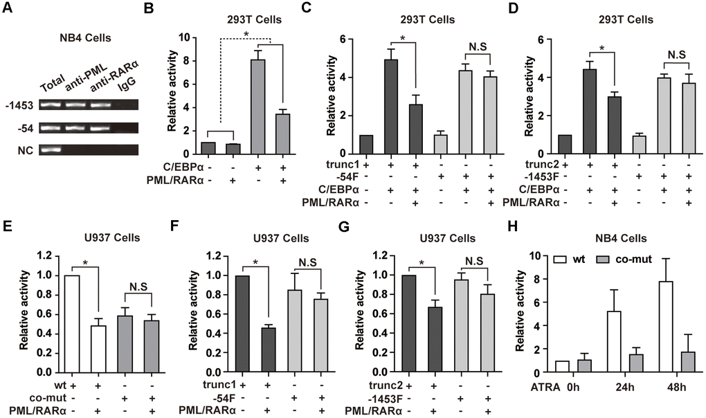 To further elucidate whether C/EBPα is required for PML/RARα-mediated repression of NEAT1 in hematopoietic cells, PML/RARα expression plasmid was co-transfected along with the wild-type NEAT1 promoter or the C/EBP sites double mutated construct in U937 cells, which endogenously express C/EBPα. As illustrated in Figure 3E, PML/RARα-mediated repression of NEAT1 was abolished in the co-mut promoter construct. Together with Figure 3B, the results indicated that PML/RARα functioned as an effective repressor of NEAT1 only in the presence of C/EBPα. Then we used the truncations around the -54 or -1453 site to test the repression effect of PML/RARα on NEAT1 promoter in U937 cells. As shown in Figure 3F, 3G, PML/RARα effectively suppressed the promoter activity of trunc1 and trunc2 constructs, which contains potential RAREs and RARE half motifs. Unsurprisingly when using the truncations without the potential RAREs and RARE half motifs, -54F and -1453F, PML/RARα could not significantly repress the NEAT1 promoter activity. These results collectively suggest that PML/RARα represses C/EBPα-mediated transactivation of NEAT1 through binding to NEAT1 promoter and C/EBPα is indispensable for PML/RARα-mediated suppression of NEAT1.