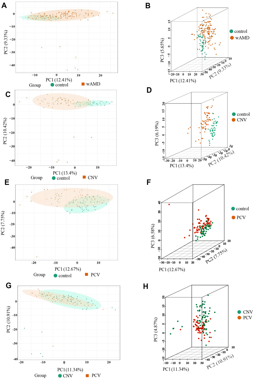 Three-dimensional principal component analysis (PCA) showed the trend of metabolites partially separated between groups, indicating differences among them [38]. The PCA results showed that the difference between the PCV group and CNV group was relatively small among all the comparison group, while the difference between the control group and CNV group was relatively large among all the comparison group (Figure 1).