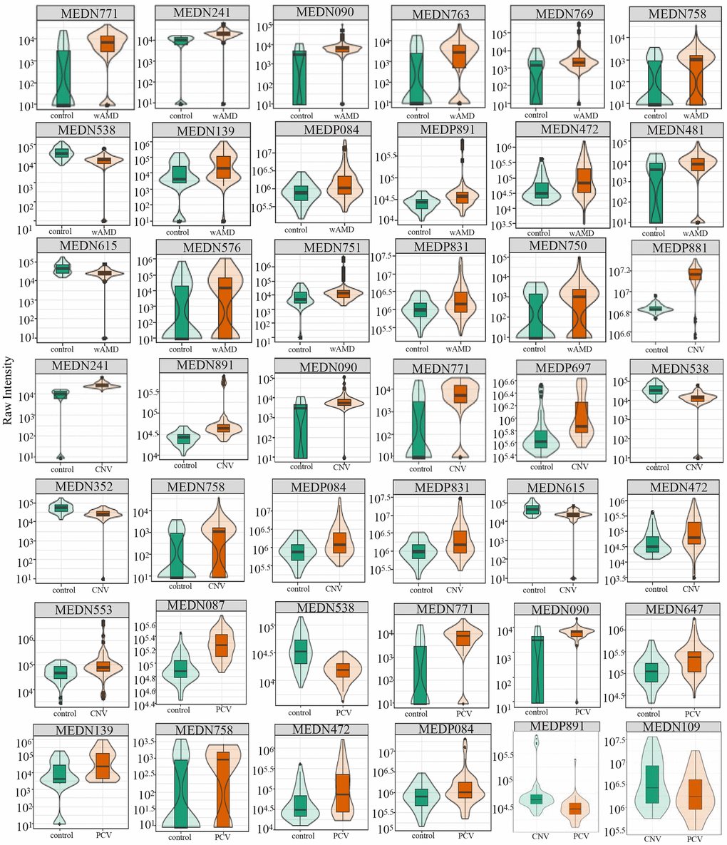 Participants in this study included 127 wet AMD patients (67 CNV, 60 PCV) and 50 healthy people. The demographic characteristics of the three groups of participants are shown in Supplementary File 1.