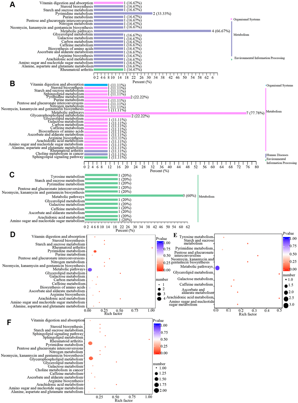 Metabolites may interact with each other to form different pathways. By using KEGG annotation of the differential metabolites [39], metabolites were classified according to the type of pathway in KEGG (Figure 4 and Table 3). These results showed that metabolic pathways involved in metabolites included vitamin digestion and absorption, pyrimidine metabolism, biosynthesis, metabolic pathway, glycerophospholipid metabolism and other pathways.