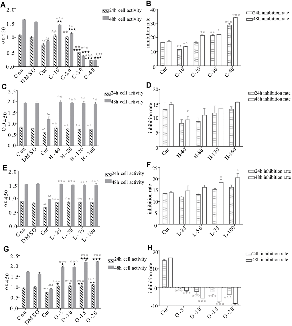 CCK-8 cell proliferation and cytotoxicity assay kit (Solarbio, China) was used according to the manufacturer's instructions. The HRPECs suspension was seeded in 96 well plates with 100 μL (about 1×104 cells). After cells adhered to the wall, relevant reagents were added and incubated for 24 h and 48 h. Then, a 10 μL CCK-8 cell proliferation and cytotoxicity assay kit was added to each well, and cultured for 1-4 h. The optical density (OD) at 450 nm was determined by an enzyme-labeled instrument.