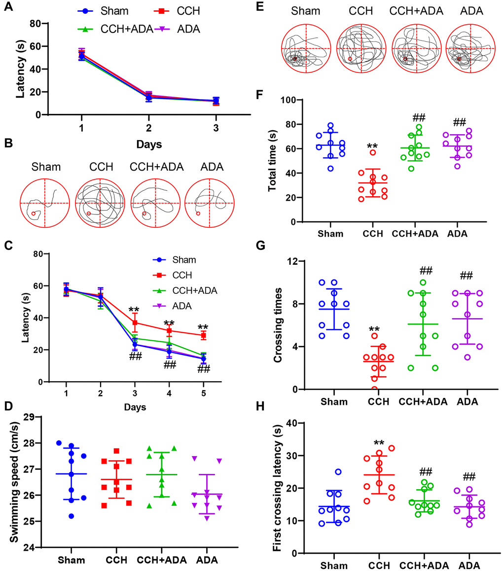 To elucidate the potential protective role of ADA treatment in CCH rats, we used the Morris water maze test to evaluate the memory retention ability of the four groups. We first performed a three-day visible platform test to determine whether 2VO surgery or ADA treatment affected vision. As shown in Figure 2A, the learning traces of the four groups showed high similarity, indicating that vision was intact in all groups. Then, we subjected the rats to the hidden platform task. We found that after 5 days of training, the search strategy of the CCH rats was still random, while sham rats, CCH+ADA rats and ADA rats displayed a straightforward or target-based style (Figure 2B). By analyzing latencies on the five days of the learning phase, we found that CCH rats showed a longer latency to find the platform than sham rats on the third day. Rats treated with ADA displayed a shorter latency than the CCH rats, and no difference in latency was found among the sham, CCH+ADA and ADA rats (Figure 2C). The discrepancies among the four groups were not due to locomotor disability because the swimming speeds of the rats in the four groups were comparable (Figure 2D). In the probe trial test, the rats in the CCH group showed a shorter total time, fewer crossings and a longer latency to first crossing than the rats in the sham group, while ADA treatment significantly reversed these abnormalities (Figure 2E–2H). These data strongly suggested that ADA treatment can rescue learning and memory impairments in CCH rats.
