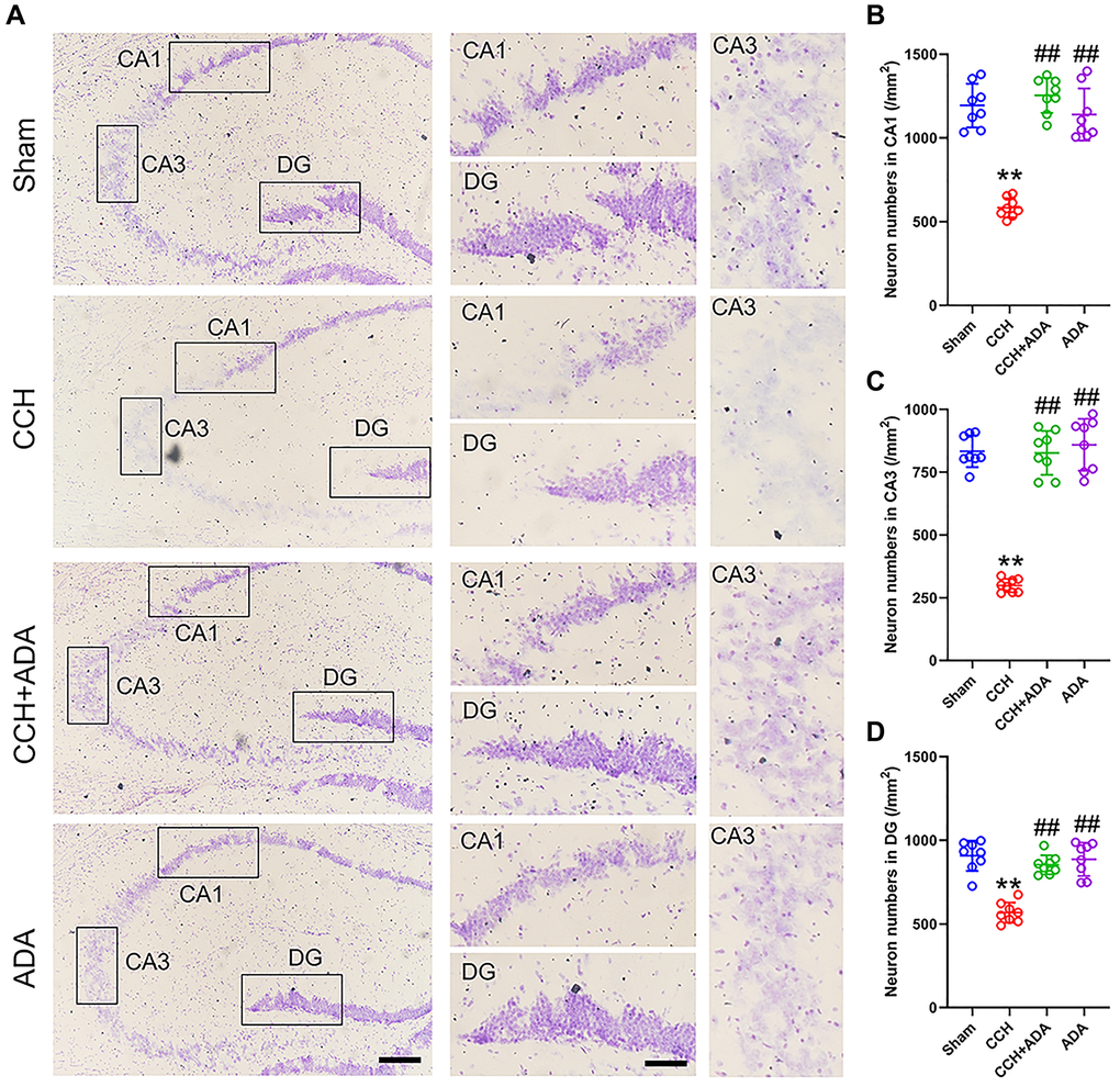 Previous studies suggested that the degree of neuronal loss in the CA1 and CA3 regions positively correlates with the severity of memory impairment [17]. We thus performed Nissl staining to explore whether ADA administration could rescue neuronal loss in the hippocampi of CCH rats. We found that the neuron number in CCH rats was significantly reduced in the CA1, CA3 and DG regions, which was consistent with previous reports [18]. After treatment with ADA for 2 months, neuronal loss was apparently ameliorated (Figure 3A–3D). No difference was found between the ADA alone-treated group and the sham group.