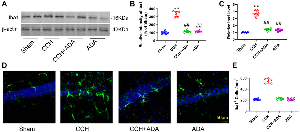 Neuroinflammation, especially that mediated by activated microglia, has been suggested to play important roles in brain damage in CCH [19, 20]. We thus evaluated microglial activation and polarization in CCH rats treated with ADA. We found that CCH led to the elevation of Iba1 mRNA and protein levels and an increase in the number of Iba1-positive cells in the hippocampus (Figure 4A–4E). Administration of ADA reversed the activation of microglia induced by CCH.