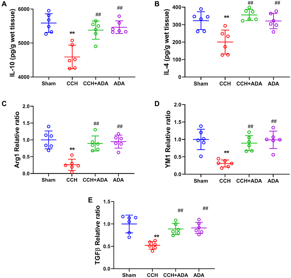 It is known that the polarization of microglia from the M2 to M1 phenotype promotes the activation of microglia and brain inflammation [21]. We therefore evaluated the polarization states of microglia upon different treatments by detecting known biomarkers for M1 and M2 microglia. We found that in CCH rats, the expression levels of the M1 markers TNFα, IL-12, IL-6, IFNγ and IL-1β were significantly upregulated. After treatment with ADA for two months, the expression of these M1 markers was reduced to normal levels (Figure 5A–5E). Moreover, CCH led to the suppression of the expression of IL-10 and IL-4 and the mRNA levels of Arg1, YM1 and TGFβ, which are well-known M2 markers. Importantly, ADA treatment restored the expression of these M2 markers to normal levels (Figure 6A–6E). Therefore, ADA treatment promotes microglial polarization to the M2 phenotype.