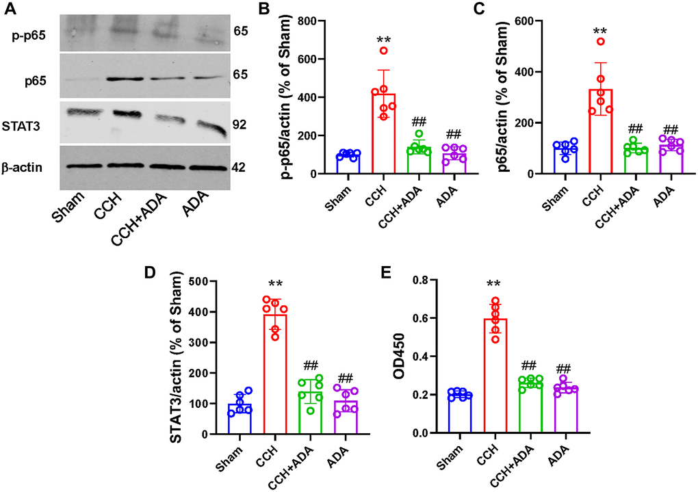 We then wanted to explore the potential mechanisms underlying the protective role of ADA in CCH. As the activation of NF-κB signaling has been identified as a key player in microglial activation and polarization [22], we assessed whether ADA could suppress NF-κB activity in CCH rats. Consistent with a previous study, the phosphorylation of the p65 subunit at the Ser536 site and the total expression of p65 and STAT3 were significantly increased in the hippocampi of CCH rats. However, ADA treatment effectively reduced the phosphorylation of p65 and the levels of p65 and STAT3 (Figure 7A–7D). Furthermore, ELISA revealed that NF-κB activity was increased in CCH rats but suppressed after ADA treatment (Figure 7E). No significant difference was found between the rats treated with ADA alone and the sham rats. These data suggested that ADA inhibits NF-κB signaling in CCH rats.