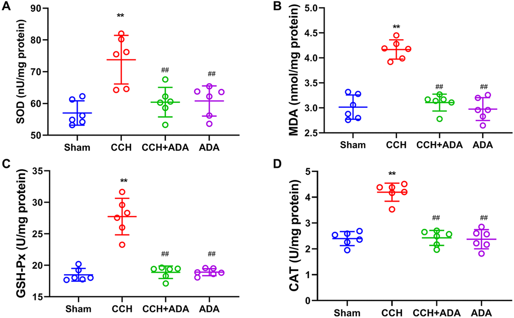 It is known that oxidative stress plays a central role in NF-κB signaling activation and that crosstalk between oxidative stress and NF-κB signaling is critical for microglial activation [23]. Thus, we evaluated the levels of SOD, MDA, GSH-Px and CAT by commercial kits. We found that CCH resulted in the elevation of SOD, GSH-Px, CAT and MDA levels, indicating an increase in lipid peroxidation and a compensatory increase in the levels of antioxidant enzymes. However, treating CCH rats with ADA significantly reduced oxidative stress (Figure 8A–8D). Therefore, administration of ADA could protect CCH rats from oxidative stress.