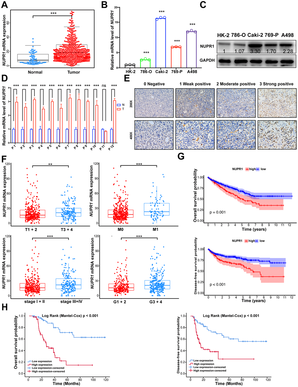 Next, we performed qRT-PCR in ccRCC cell lines and 12 paired human ccRCC tissues. NUPR1 mRNA levels were significantly increased in ccRCC cells and cancer tissues compared with HK-2 cells (human renal cortex/proximal tubular epithelial cells) and adjacent normal kidney tissues (Figure 1B, 1D). Accordingly, western blot assays showed similar results, with NUPR1 protein expression being upregulated in ccRCC cell lines (Figure 1C).