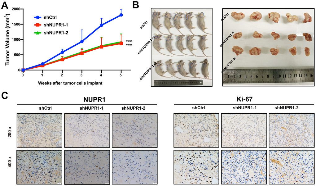 To assess the effect of NUPR1 on ccRCC tumorigenicity in vivo, we established a xenograft mouse model in which Caki-2 cells transfected with shCtrl, shNUPR1-1 or shNUPR1-2 were inoculated subcutaneously into the dorsal regions of nude mice. The xenograft assay demonstrated that the xenograft tumors in mice that received NUPR1-depleted cells were significantly reduced in terms of weight and volume compared with the control group (Figure 3A, 3B). Moreover, immunohistochemical staining revealed that Ki-67 expression was remarkably decreased in NUPR1-depleted xenografts, indicating that the knockdown of NUPR1 attenuated tumor proliferation (Figure 3C).