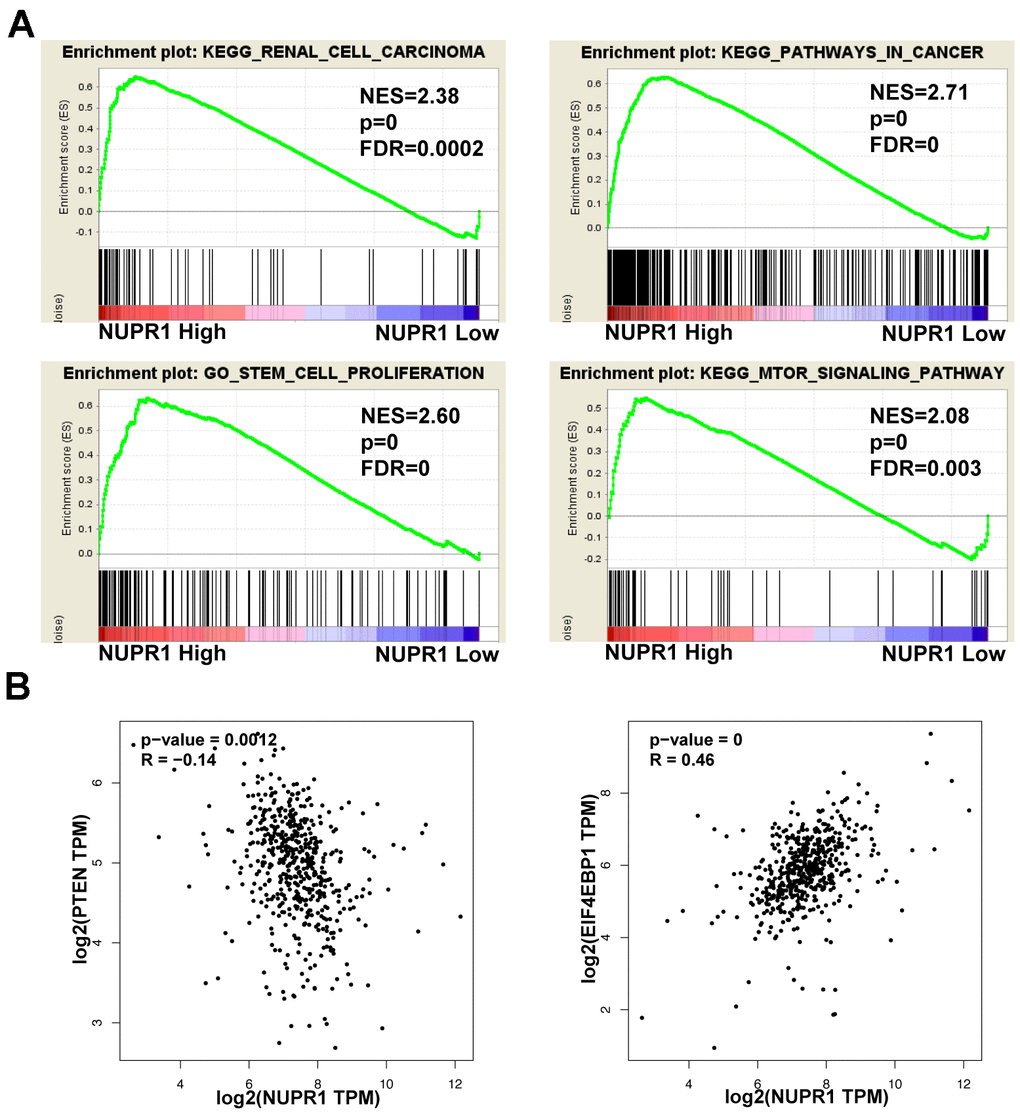To further explore the underlying mechanisms by which NUPR1 promoted ccRCC tumorigenesis, we performed GSEA based on TCGA data form and identified several enriched pathways. Notably, enrichment analysis showed that overexpression of NUPR1 was associated with the cancer pathway, cancer cell stemness, mTOR pathway and renal cell carcinoma (Figure 5A).