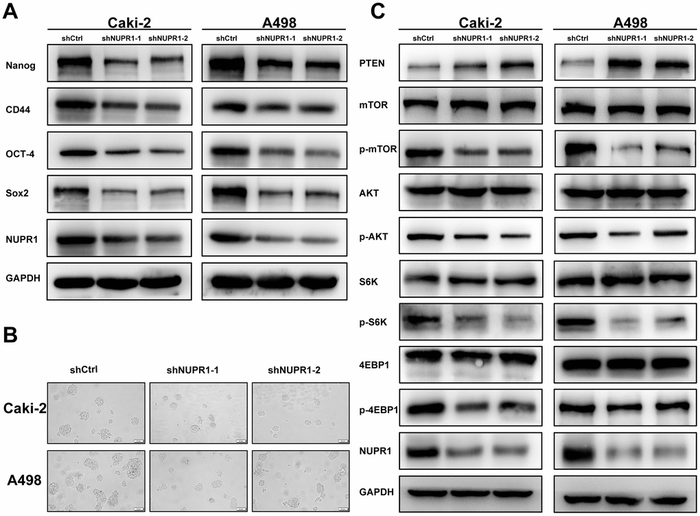 As the PTEN/AKT/mTOR pathway regulates stemness and metastasis and it is frequently activated in ccRCC, we examined the effect of NUPR1 on this signaling pathway. We conducted a correlation analysis between NUPR1 and the PTEN and 4EBP1 in GEPIA database (http://gepia.cancer-pku.cn) (Figure 5B). As shown in Figure 6C, a decrease in key proteins in the pathway, specifically phosphorylated AKT, mTOR, S6K and 4EBP1 but not in the total amount of these molecules, was observed in Caki-2 and A498 cells with NUPR1 knockdown compared with control cells. Moreover, PTEN, the negative regulator of the AKT/mTOR signaling pathway, was increased in NURP1-knockdown cells.