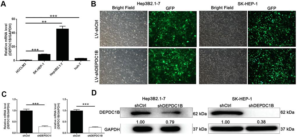The results of qRT-PCR showed that the expression level of DEPDC1B in HEP3B2.1-7, SK-HEP-1 and huh-7 cell lines was significantly higher, compared to HCCLM3 cell line (P<0.05) (Figure 2A). The results indicated that HEP3B2.1-7 and SK-HEP-1 cell lines were more appropriate to research the functions of DEPDC1B. For the purpose of studying the effects of DEPDC1B knockdown, LV-shDEPDC1B and LV-shCtrl were transfected into HEP3B2.1-7 and SK-HEP-1 cell lines. After infected for 72 h, the efficiencies of infection in all group were more than 80% under fluorescence microscope in the way of detecting the fluorescence of cells (Figure 2B). The results of qRT-PCR displayed that the knockdown efficiencies of DEPDC1B of HEP3B2.1-7 and SK-HEP-1 cell lines in shDEPDC1B group were 71.35% (P<0.001) and 74.1% (P<0.001), compared with shCtrl group, respectively (Figure 2C). The expression level of DEPDC1B in shDEPDC1B group were down-regulated obviously compared with DEPDC1B in shCtrl group by western blot (Figure 2D). DEPDC1B knockdown cell models were constructed successfully according to the results of qRT-PCR and western blot.