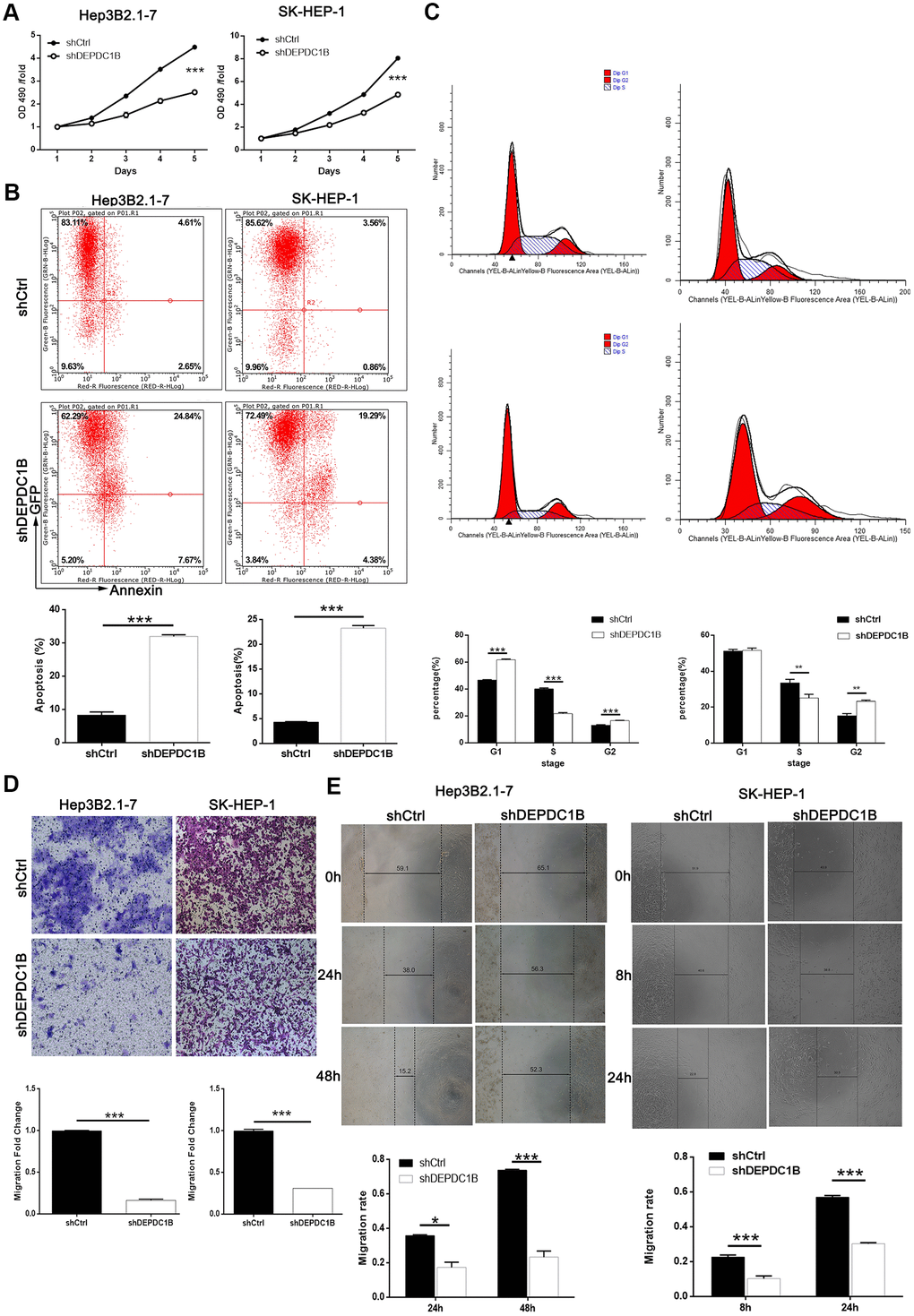MTT assay was performed to study the effects of DEPDC1B knockdown on HCC cell proliferation, and the results showed that the proliferation in shDEPDC1B group was slower than that in shCtrl group (P<0.001) (Figure 3A). The results of flow cytometry assay exposed that the percentage of apoptotic cells in shDEPDC1B significantly increased compared with shCtrl (P<0.001) (Figure 3B). Further study in cell cycle showed the cells in G2 phase had significant increase in shDEPDC1B group compared with shCtrl group after cultured for 5 days (Figure 3C). Transwell assay and wound-healing assay were constructed to investigate the migration. Transwell assay showed that, compared to shCtrl group, the migration ability of HEP3B2.1-7 cells (48 h) and SK-HEP-1 cells (24 h) in shDEPDC1B were significantly decreased (P<0.001) (Figure 3D). The results of wound-healing assay showed that the average migration rate of HEP3B2.1-7 cells (48 h) and SK-HEP-1 cells (24 h) in shDEPDC1B group were decreased by 68% (P<0.001) and 47% (P<0.001), compared with shCtrl group (Figure 3E). Collectively, knockdown of DEPDC1B suppressed HCC progression by inhibiting cell proliferation and migration, promoting HCC cell apoptosis and leading to G2 phase arrest.