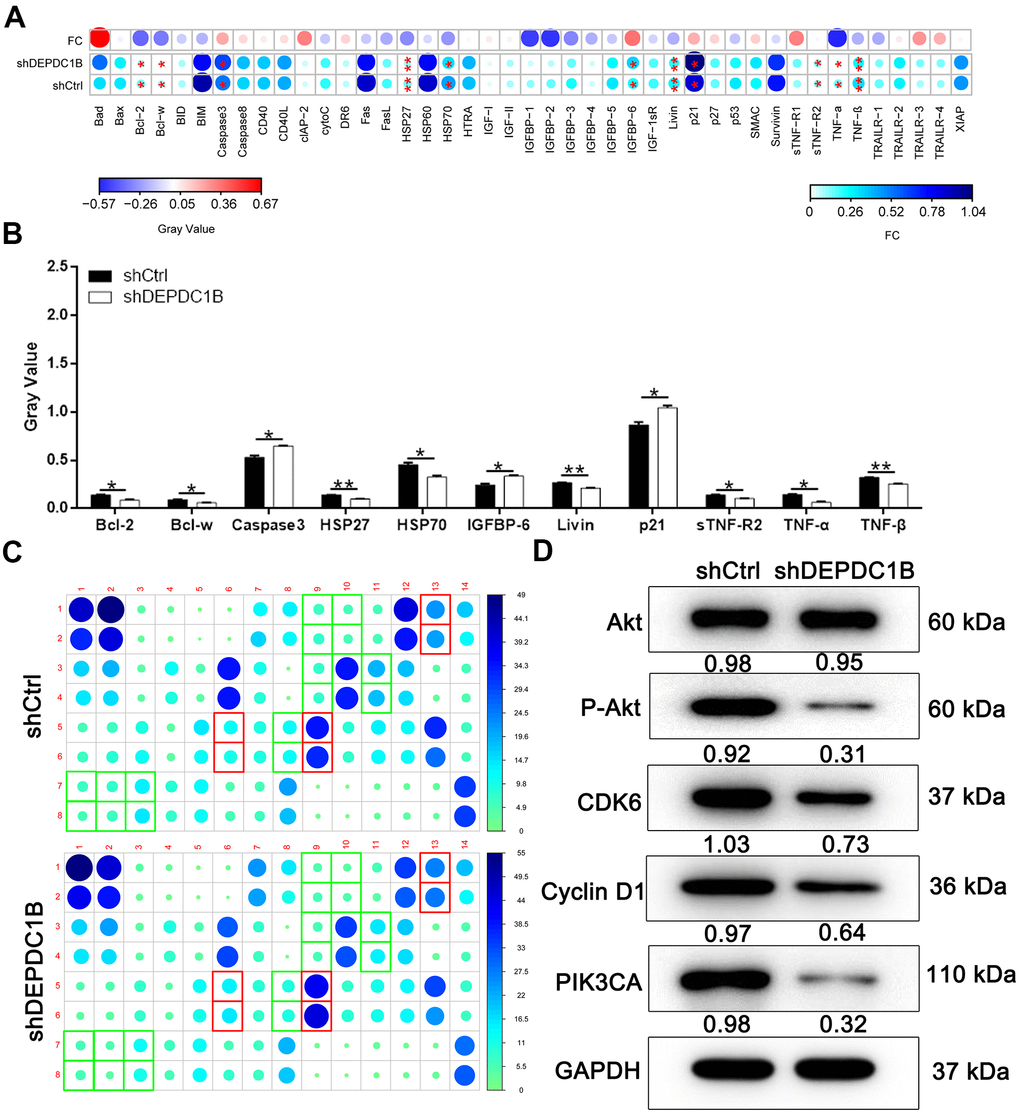 Human apoptosis antibody array was used to search for the affected proteins in the SK-HEP-1 cells infected with LV-shDEPDC1B and LV-shCtrl, because the specific function mechanism of DEPDC1B knockdown in cell growth was unclear. The expression of Caspase 3, p21, and IGFBP-6 was significantly up-regulated in shDEPDC1B compared with shCtrl (P<0. 05). The expression of Bcl-2, Bcl-w, HSP27, HSP70, Livin, sTNF-R2, TNF-α, and TNF-β was significantly down-regulated in shDEPDC1B, compared to shCtrl (P <0.05) (Figure 4A–4C). The results of western blot in SK-HEP-1 cells showed that the expression of P-Akt, CDK6, Cyclin D1, and PIK3CA was down-regulated in shDEPDC1B group, compared to shCtrl group (Figure 4D).