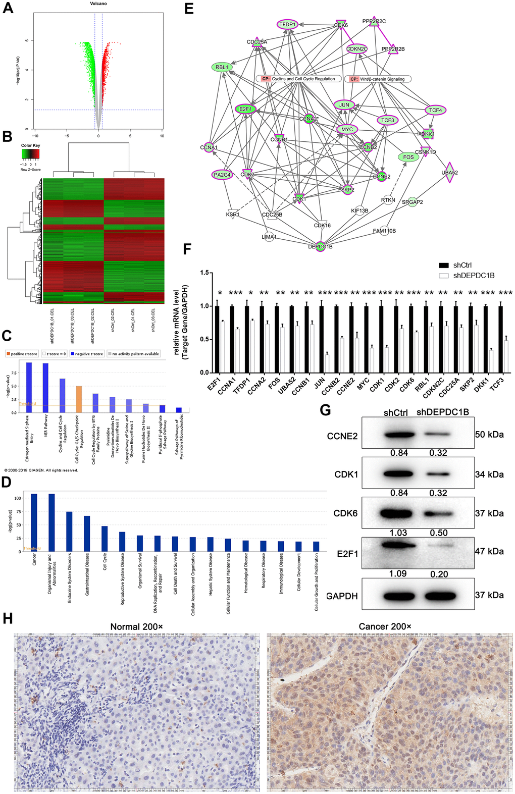 For the purpose of exploring the molecular changes after DEPDC1B knockdown, transcriptomes between shCtrl cells and shDEPDC1B cells were compared by RNA-seq. The results of volcano plot and clustering analysis showed that 1063 DEGs (differentially expressed genes) were upregulated and 1320 DEGs were downregulated (Figure 5A, 5B). IPA pathway enrichment analysis of DEGs showed that DEGs were mostly enriched in Salvage Pathways of Pyrimidine Ribonucleotides, NER Pathway, Estrogen-mediated S-phase Entry, and Cyclins and Cell Cycle Regulation pathway and the three pathways were significantly inhibited, which indicated that DEGs played important suppressive roles in these pathways (Figure 5C). The IPA analysis about disease and function showed that cancer was one of the mostly enriched diseases (Figure 5D), which suggested that the DEGs found in the experiment are mostly relevant to cancers. DEPDC1B could affect CCNA1, JUN, CCNB2, CCNE2, CDK1, CDK6, etc in Cyclins and Cell Cycle Regulation, and Wnt/β-catenin Signaling pathway through EED and FANCD2 (Figure 5E). Further qRT-PCR showed that the expression levels of CCNA1, JUN, CCNB2, MYC, CDK1, and CDK6, were down-regulated in shDEPDC1B group, compared to shCtrl group (P<0.001) (Figure 5F). The results of western blot showed that the expression of CCNE2, CDK1, CDK6, and E2F1 was significantly down-regulated in shDEPDC1B group, compared to shCtrl group (Figure 5G). Collectively, the DEPDC1B knockdown suppressed the expression of CCNE2, CDK1, CDK6, and E2F1 at mRNA or protein level through Cyclins and Cell Cycle Regulation, and Wnt/β-catenin Signaling pathway. Among the several selected DEGs, CDK1 was found to be overexpressed in tumor tissues, compared with para-carcinoma tissues by IHC analysis (Figure 5H).