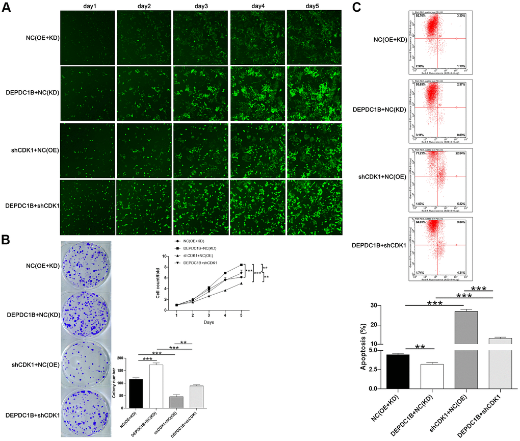 Cell lines which expressed more DEPDC1B and CDK1 were selected among HEP3B2.1-7, SK-HEP-1, huh-7, MHCC97-L, BEL-7404, and HCCLM3 cell lines by qRT-PCR for subsequent study. The newly produced LV-shDEPDC1B and LV-shCtrl were used to infected the cell lines SK-HEP-1 and HEP3B2.1-7. SK-HEP-1 cell line was infected by LV-NC (OE+KD), LV-DEPDC1B+NC(KD), LV-shCDK1+NC(OE), and LV-DEPDC1B+shCDK1.. Cells in logarithmic growth phase were digested by 0.05% Trypsin-EDTA to make into cell suspension and cultured in the medium consisting of RPMI 1640 and 10% FBS for 24 h. When the cells achieved the level of 2×10^5/well, the lentivirus (40 μL, 1×10^8 TU/mL) were used to infected the cells in ENI. S+Polybrene (MOI 20) for 20 h. Finally, the expression of GFP (green fluorescent protein) was observed with the assistance of fluorescence microscope for detecting the efficiency of cell infection. When the cell fusion in NC (OE+KD) group, DEPDC1B+NC(KD) group, shCDK1+NC(OE) group, and DEPDC1B+shCDK1 group reached 80%, the Celigo cell counting assay was used to detect the influence of DEPDC1B and CDK1 on cell proliferation according to the manufacturer’s instructions. The number of cells were detected with Celigo and analyzed to obtain Fold Change, finally.