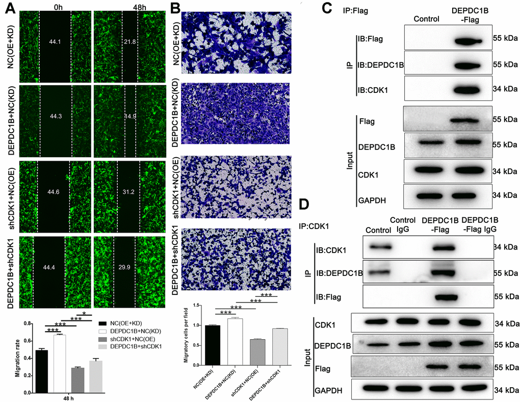 In conclusion, this is the first study concerning about DEPDC1B in HCC development. The study confirmed that DEPDC1B is overexpressed in hepatic carcinoma tissues, and the development of HCC were regulated by DEPDC1B through controlling cell apoptosis, inducing G2 phase arrest, migration, and proliferation. It can interact with CDK1, and played a key role in DEPDC1B regulating HCC progression. The study has proved that DEPDC1B play an important role in the progression of HCC and can be treated as a novel gene target to instruct the treatment of HCC. Thus, further studies may accelerate our understanding about the functional role of DEPDC1B in HCC.