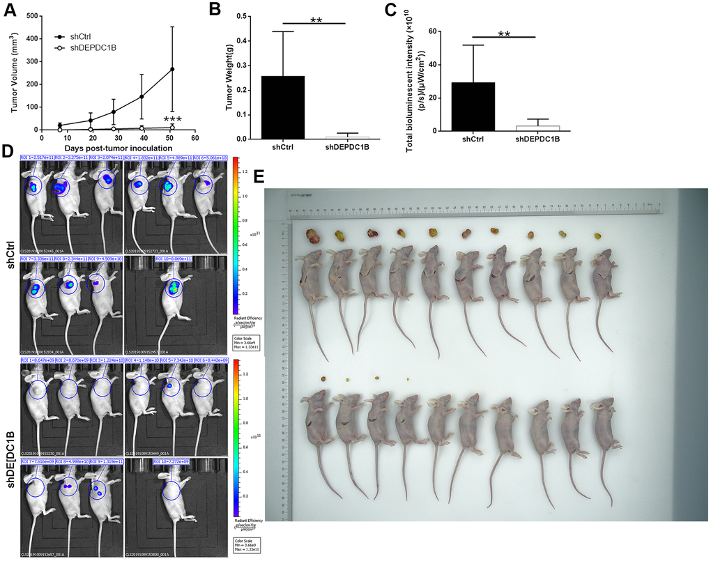 The mice xenograft model was created with 4-weeks nude mice (BALB/c, female, Charles River, Beijing, China) according to the manual instructions and the experimental procedure continued for 51 days. A total of 20 mice were randomly divided into two groups before mice were injected cells into their front legs. 4×10^6 SK-HEP-1 cells/mouse transfected with LV-shDEPDC1B and LV-shCtrl were injected into the mice in shDEPDC1B group and shCtrl group, respectively. The length, width, and fluorescence intensity of tumors were detected with small animal living imaging system after mice had been anesthetized with intraperitoneal injection of 0.7% sodium pentobarbital. At the final of experiment, tumors in mice were resected to detect the weight and calculate volume (based on the formula: volume = length × width^2 × 3.14/6) after being sacrificed with excessive sodium pentobarbital followed by cervical dislocation method. All the animal experimental protocols were approved by the Ethics Committee at the First Affiliated Hospital of Zhengzhou University.