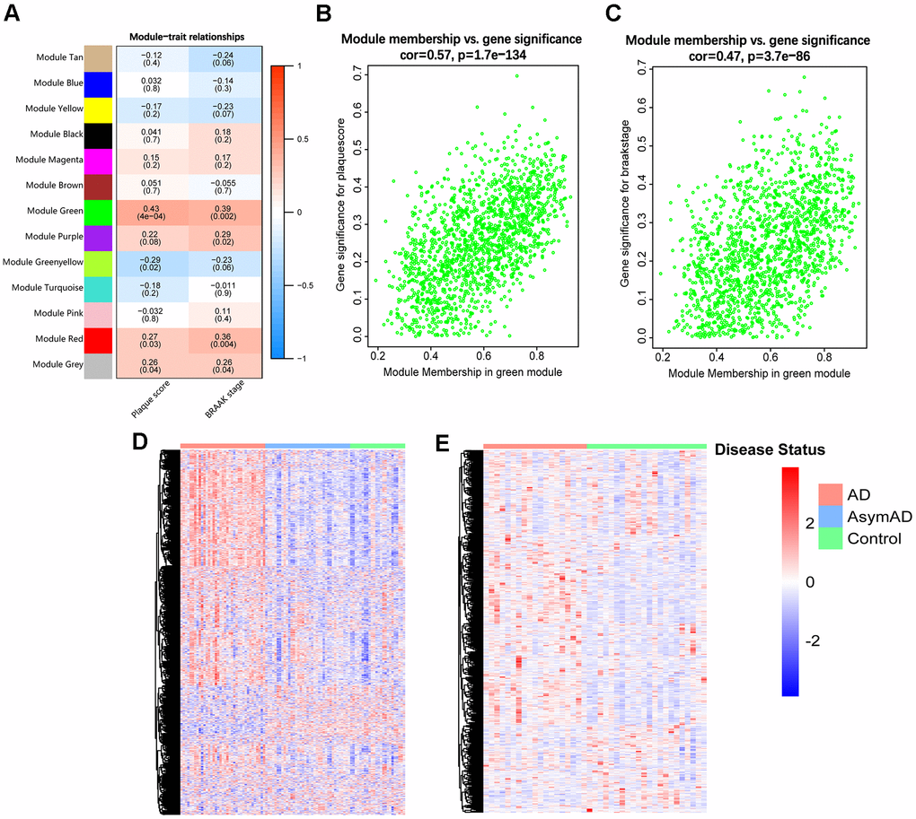 To identify the target module from the 12 resulting gene modules, we performed a module-trait analysis, and the analytical results were visualized in a heatmap, where the green module was detected positively correlated with both plaque score (Aβ deposition) (r = 0.43, p = 4×10−4) and BRAAK stage (p-tau accumulation) (r = 0.39, p = 0.002) (Figure 1A). In addition, the correlation between the MM value and GS value of each gene in the green module was analyzed. The results indicated that genes in the green module showed strong relationships with both plaque score (r = 0.57, p =1.7e−134) and BRAAK stage (r = 0.47, p = 3.7e−86) (Figure 1B, 1C). Thus, the green module was chosen as the target module for further study.