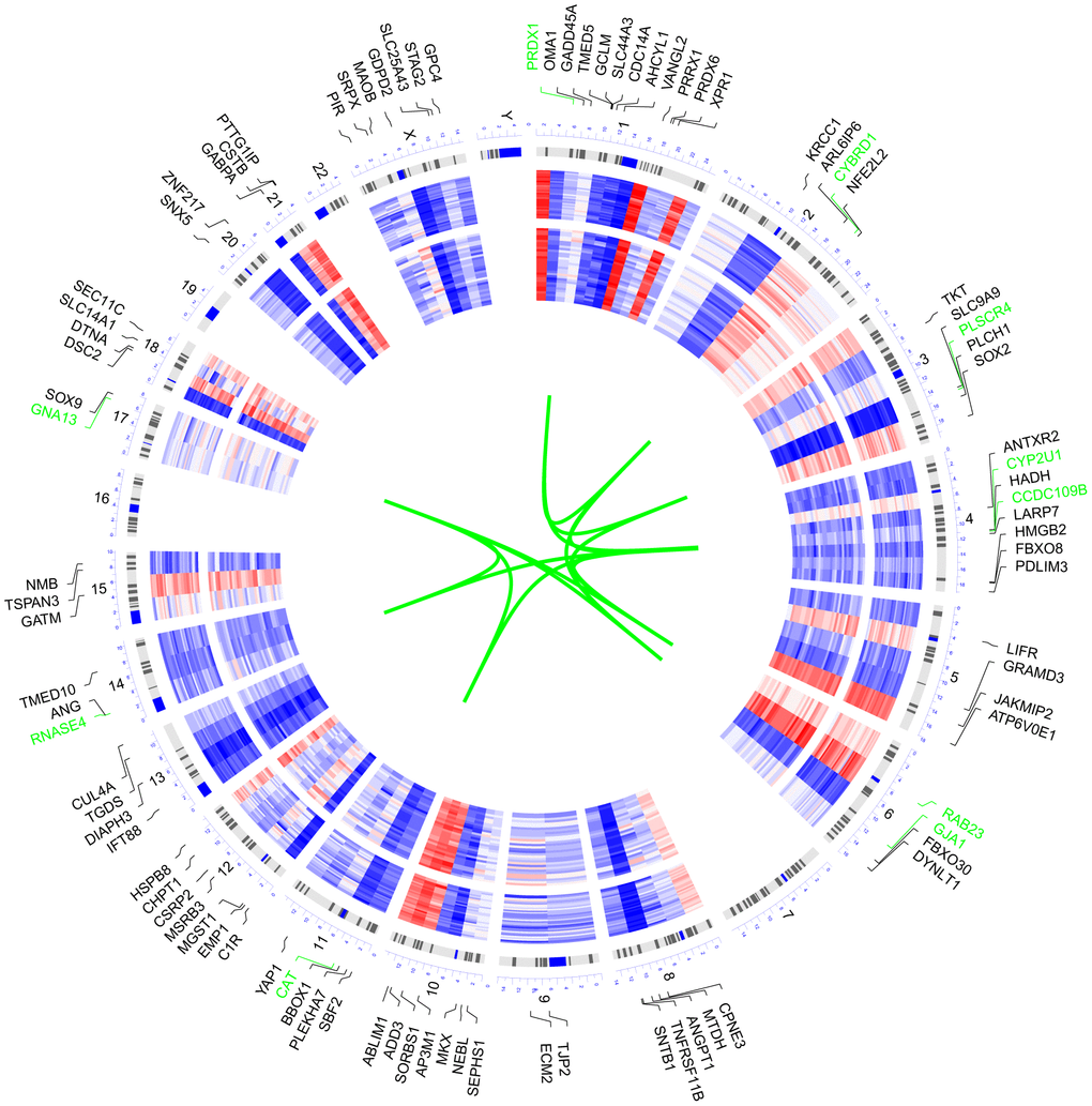 We selected 100 genes with the highest MM value to explore the chromosome distribution and overall expression pattern of the target module (Figure 2). Among the 100 genes, the top 10 genes possessing the highest MM value, including GNA13, CYP2U1, PLSCR4, CAT, GJA1, PRDX1, CCDC109B, RNASE4, CYBRD1, and RAB23, were located on chromosomes 17, 4, 3, 11, 6, 1, 14, and 2.