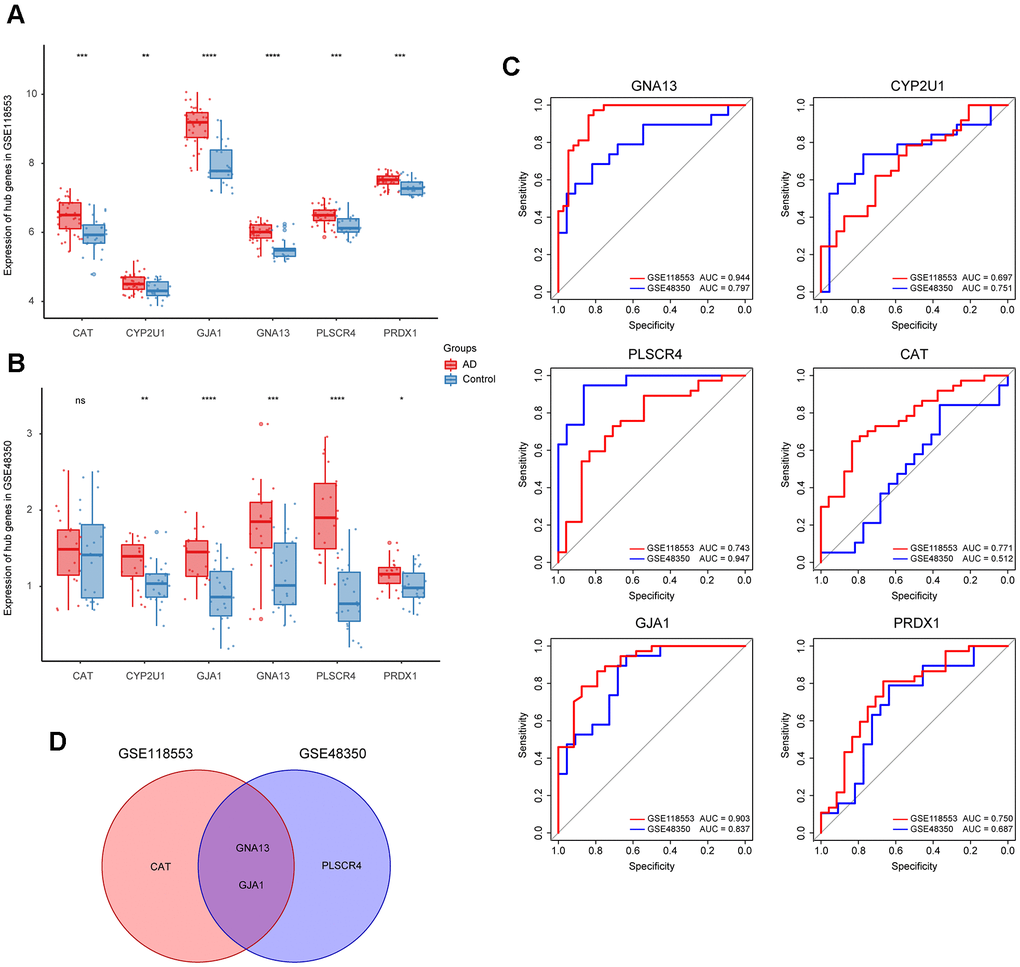 To refine hub genes, we firstly explored the expression levels of those 6 hub genes in GSE118553 and GSE48350 (Figure 3A, 3B). Results showed that all hub genes were differently expressed in AD and control groups except for CAT. Further refinement was conducted through the receiver operating characteristic (ROC) curve analysis based on GSE118553 and GSE48350 (Figure 3C). The top 3 genes with the highest area under curve (AUC) value in each ROC analysis were picked out, and the intersecting genes were selected. As a result, GNA13 and GJA1 were identified as refined hub genes of the target module (Figure 3D).
