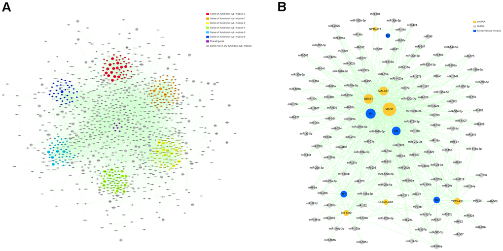To select hub ncRNAs, we constructed a lncRNA-miRNA-functional sub-module ceRNA network. The interaction analysis of lncRNA-functional sub-module and miRNA-functional sub-module predicted 84 lncRNAs and 254 miRNAs strictly participating in 96 and 316 pairs of interplays within all 6 functional sub-modules. After a comprehensive analysis of interactions among functional sub-modules and screened ncRNAs, 5 functional sub-modules, 7 lncRNAs, and 148 miRNAs were selected for the ceRNA network construction (Figure 4B). In the ceRNA network, we found that one lncRNA, MEG3, and 22 miRNAs, which were listed in Table 2, could regulate more functional sub-modules than other ncRNAs, and they were determined as hub ncRNAs in our study.