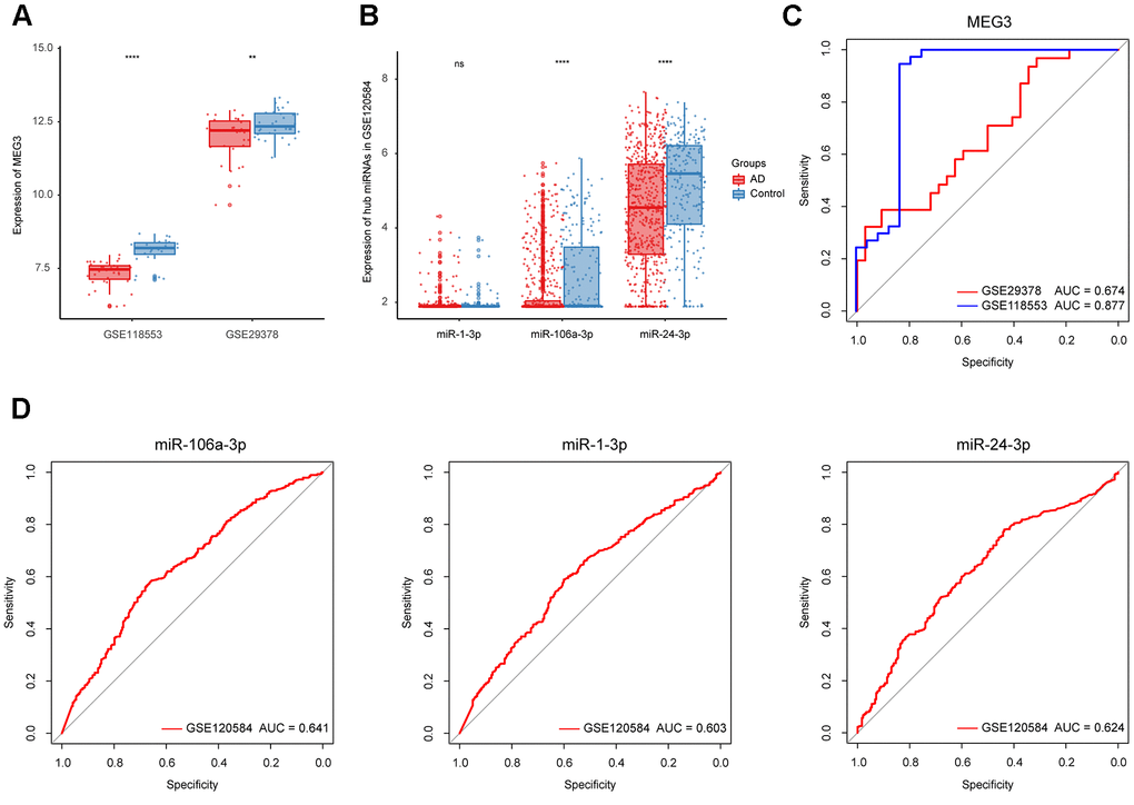 To refine hub ncRNAs, we performed ROC analyses in three datasets, where GSE118553 and GSE29378 were employed for lncRNA refinement, and GSE120584 was used for miRNA refinement. The results showed that the AUC value of MEG3 was greater than 0.85 based on GSE118553, which indicated its potential role in AD diagnosis (Figure 5C). As for miRNA, the top 3 miRNAs with the highest AUC value, including miR-106a-3p, miR-1-3p, and miR-24-3p, were filtered from 22 hub miRNAs for further identification (Table 2 and Figure 5D). We then displayed the expression of MEG3, miR-106a-3p, miR-1-3p, and miR-24-3p in AD and control groups based on the three datasets. The results suggested that the expression of MEG3 was significantly decreased in AD patients (Figure 5A). And miR-106a-3p and miR-24-3p were differently expressed between AD and control groups, while miR-1-3p had no expression difference in the two groups (Figure 5B). Finally, MEG3, miR-106a-3p, and miR-24-3p were selected as refined hub ncRNAs in our study.