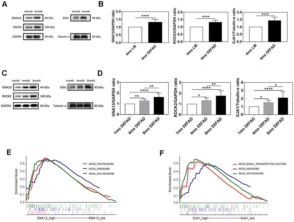 To further verify the association between GNA13, ROCK2, GJA1, and aging in 5XFAD mice. We examined the expression of GNA13, ROCK2, and GJA1 in 1 mo, 4 mo, and 8 mo 5XFAD mice. As expected, the results indicated that compared with 1 mo 5XFAD mice, the expression of GNA13, ROCK2, and GJA1 was higher in the 4 mo and 8 mo groups, while 8 mo 5XFAD mice had the highest expression of all three genes (p < 0.05), which suggested that GNA13, ROCK2, and GJA1 were significantly upregulated in 5XFAD mice with the increase of age (Figure 6C, 6D).