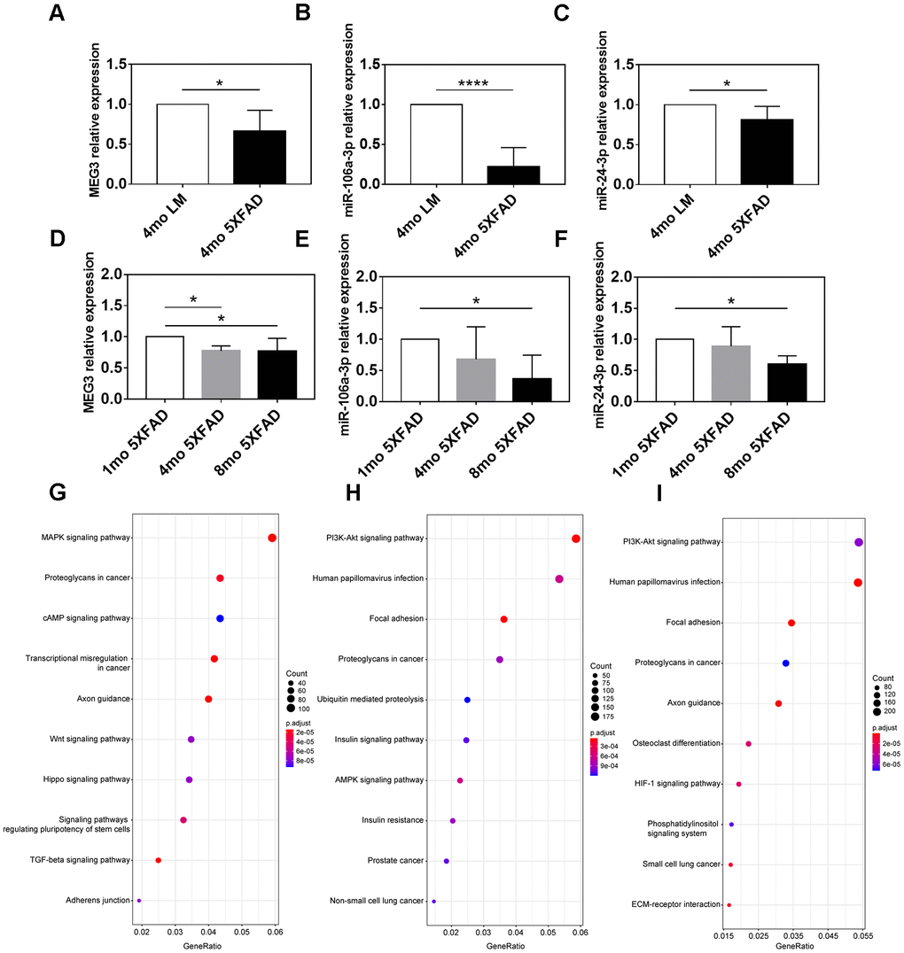 We further explored the association between MEG3, miR-106a-3p, miR-24-3p, and aging of 5XFAD mice. The results indicated that MEG3 was decreased in 4 mo and 8 mo groups (p < 0.05), compared to 1 mo group, but there was no expression difference between 4 mo group and 8 mo group (p > 0.05) (Figure 7D). MiR-106a-3p and miR-24-3p were both downregulated in 8 mo group, compared to 1 mo group (p < 0.05), however, there was no difference between 4 mo group and the other two groups (p > 0.05) (Figure 7E, 7F). In summary, the above results indicated that the expression of MEG3, miR-106a-3p, and miR-24-3p was partly associated with the aging of 5XFAD mice.