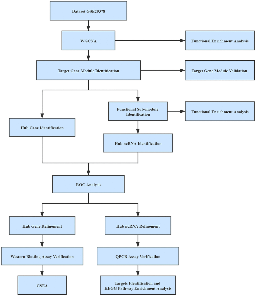 Microarray datasets, including GSE29378, GSE118553, GSE48350, and GSE120584, were collected from the GEO database. Details of each microarray dataset were provided in Table 3. GSE29378 was employed for the identification of target module, validation of MEG3, and GSEA. GSE118553 was used for validation of hub genes and MEG3. GSE48350 and GSE120584 were employed for validation of hub genes and hub miRNAs, respectively.