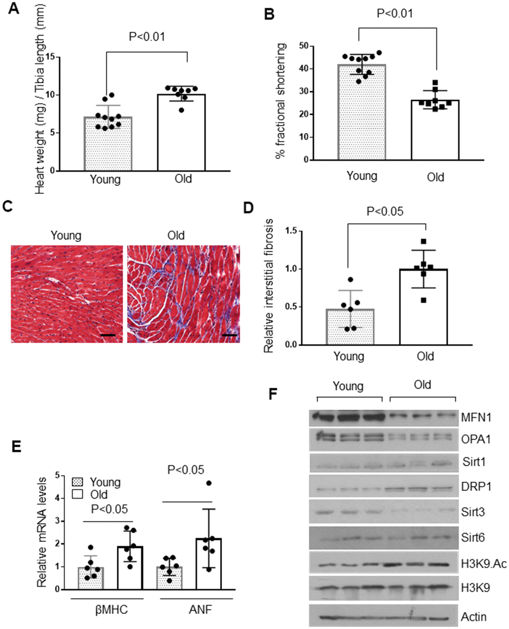 We also measured the expression levels of other sirtuins in the heart of young and old mice. We did not find any difference in Sirt1, but Sirt3 levels were significantly reduced in aged mice (Figure 1F and Supplementary Figure 3A, 3B). This was associated with reduced levels of OPA1 and MFN1 (proteins involved in mitochondrial fusion) and increased expression of DRP1 (a protein involved in mitochondrial fission) in aged mice, compared to younger animals (Figure 1F and Supplementary Figure 3C–3E). Thus, these data indicated that, compared to young mice, aged animals have well-established cardiac hypertrophy associated with reduced Sirt6 availability at the chromatin and dysregulation of mitochondrial Sirt3 and fusion-fission dynamics.