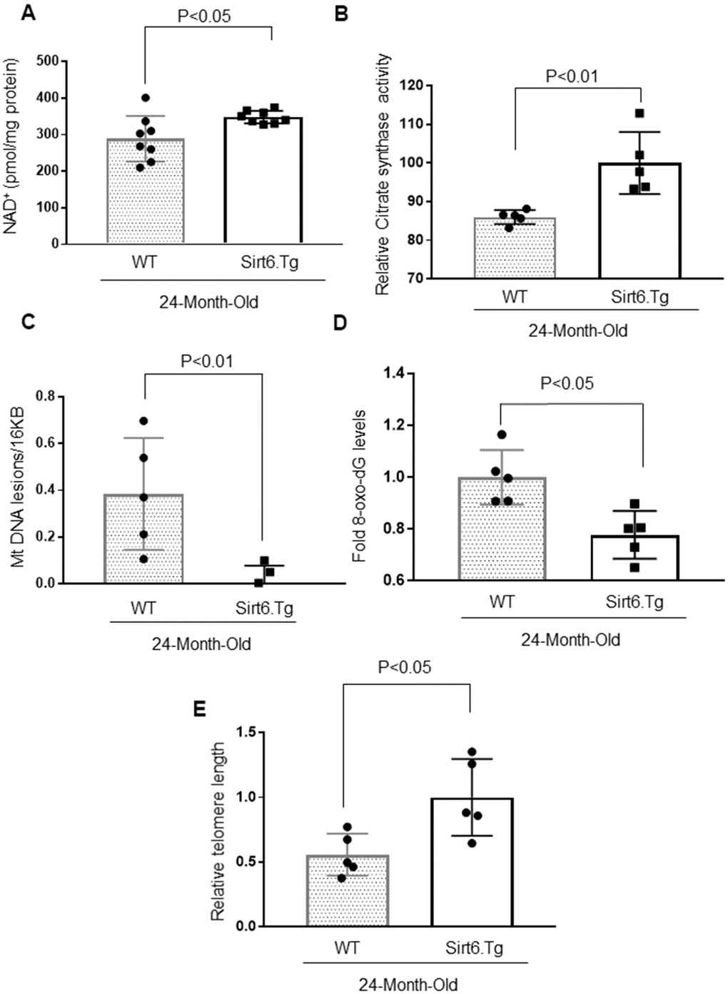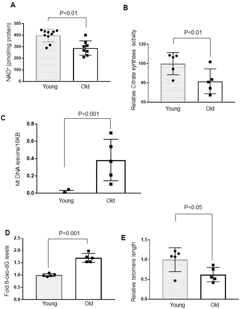 Nicotinamide adenine dinucleotide (NAD+) is fundamental to cellular energy metabolism, and depletion of NAD+ is one of the hallmarks of aging and age-related diseases [21]. Therefore, we compared the intracellular NAD+ levels in young and old mice, and found that aging caused depletion of cardiac NAD+ levels by ~40% (Figure 2A). Due to the decreased Sirt3 and NAD+ levels, we speculated that the activity of citrate synthase, a substrate of Sirt3, could be affected. Citrate synthase is a mitochondrial enzyme involved in the first step of the TCA cycle. It catalyzes acetate and oxaloacetate condensation to form citrate and, thus, is a key marker for mitochondrial metabolic function [41]. As expected, citrate synthase activity was significantly reduced in aged mice (Figure 2B). The compromised function of mitochondria is also associated with increased mitochondrial DNA lesions. In agreement with this, we found significantly increased mitochondrial DNA damage in older mice (Figure 2C). Earlier studies have documented an age-associated increase in oxidative DNA damage, which can be measured by determining the accumulation of 8-oxo-dG adducts (7-8-dihydro-8-oxo-2 deoxyguanosine) [42, 43]. Aged mice hearts showed a significant accumulation of 8-oxo-dG adducts compared to younger mice (Figure 2D). We also found increased telomere loss in aged mice, yet another hallmark of aging (Figure 2E). Together, these results suggest that cardiac aging is associated with altered functions of Sirt3, Sirt6 and loss of mitochondrial DNA integrity.