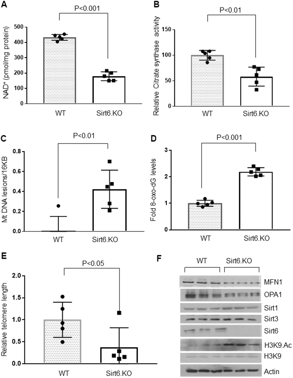 To test whether Sirt6 deficiency contributed to cardiac aging, we analyzed the hearts of whole-body Sirt6 knockout mice. Like aged mice, four weeks old, Sirt6 deficient mice showed decreased cardiac NAD+ levels and decreased citrate synthase activity compared to their wild-type littermates (Figure 3A, 3B). Hearts of Sirt6.KO mice also showed increased mitochondrial DNA lesions and increased accumulation of 8-oxo-dG adducts (Figure 3C, 3D). Sirt6 deficient hearts also showed significantly shortened telomeres (Figure 3E). We also analyzed Sirt6.KO hearts for proteins associated with perturbations in mitochondrial dynamics. The western blot analysis showed increased H3K9 acetylation (Figure 3F and Supplementary Figure 4C) and reduced levels of OPA1 and MFN1 (Figure 3F and Supplementary Figure 4A, 4B) in Sirt6 deficient hearts, compared to the wild-type controls. However, we did not find any difference in Sirt1 and Sirt3 levels between wild-type and Sirt6.KO mice (Figure 3F and Supplementary Figure 4D, 4E). These results suggest that Sirt6 deficient heart shows characteristics of aging.