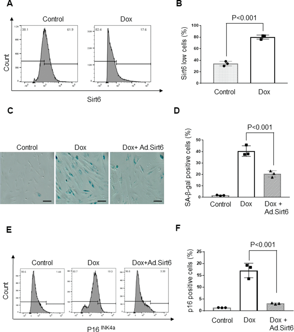 To induce senescence in vitro, H9c2 cardiomyocytes were treated with 0.5 μM doxorubicin. Following 24 hours of treatment, doxorubicin was removed, and cells were maintained in Dulbecco's modified Eagle's medium (DMEM; Invitrogen) supplemented with 1% penicillin-streptomycin and 10% fetal bovine serum (complete growth medium) for 10 days. Sirt6 and empty adenovirus were purchased from Vector Biolabs (Malvern, PA, USA) and were used at an MOI of 5.