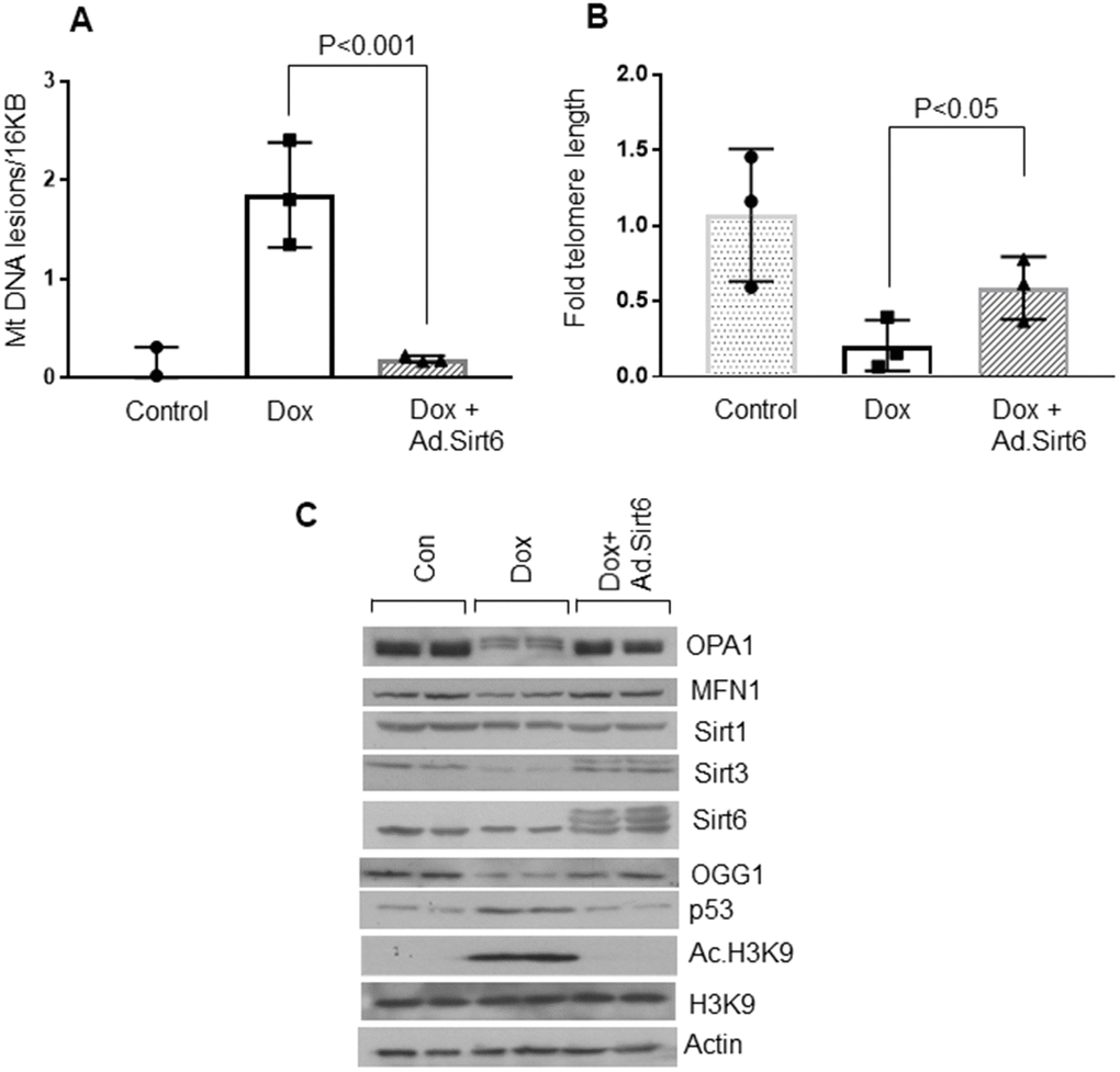 Telomere dysfunction has been shown to induce mitochondrial dysfunction in the heart [44]. To further investigate anti-senescence characteristics of Sirt6, we measured mitochondrial DNA lesions and telomere length in H9c2 cardiomyocytes subjected to undergo senescence, with or without Sirt6 over-expression. Consistent with our previous observations, Sirt6 over-expressed cardiomyocytes showed reduced mitochondrial DNA damage, and longer telomere length than cells not receiving Sirt6 overexpression, confirming that Sirt6 can protect cells from undergoing senescence (Figure 5A, 5B). We also assessed mitochondrial health by determining mitochondrial protein levels in the same groups of cells. Consistent with the above results, senescent cells showed reduced levels of mitochondrial proteins, OPA1, MFN1, OGG1, and Sirt3, and increased levels of p53 and acetylated H3K9. However, Sirt1 levels remain unchanged. Correspondingly, Sirt6 overexpressed cells maintained these protein levels similar to that of controls (Figure 5C and Supplementary Figure 5A–5G). These results strongly indicate that Sirt6 could block the senescence of cardiomyocytes.