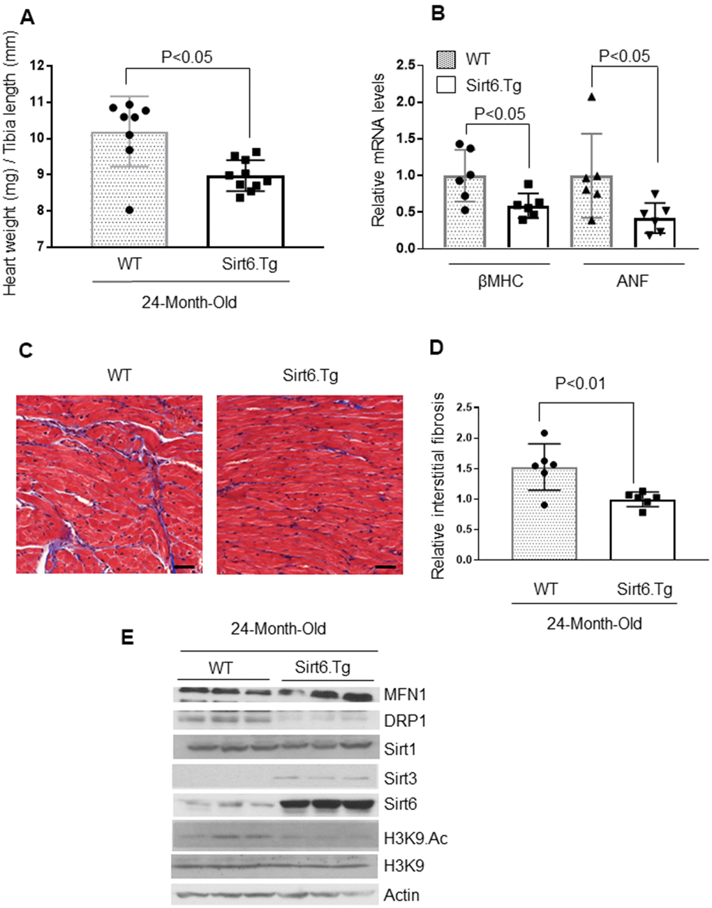 To evaluate the anti-aging effects of Sirt6 in vivo, we generated whole body Sirt6 over-expressing transgenic mice, and maintained them for 24-months, along with their non-transgenic wild-type littermates [9]. Sirt6.Tg mice showed reduced cardiac hypertrophy, as measured by a decreased HW/TL ratio and mRNA levels for βMHC and ANF, compared to non-transgenic wild-type controls (Figure 6A, 6B). Additionally, WT mice also showed increased fibrosis levels than Sirt6.Tg mice (Figure 6C, 6D). Further, mitochondrial protein analysis showed increased expression of MFN1 and decreased expression of mitochondrial fission protein DRP1 in Sirt6.Tg mice hearts, compared to same-age wild-type controls. Sirt6.Tg hearts also showed increased levels of Sirt3 and decreased levels of acetylated H3K9. No change in Sirt1 levels was observed (Figure 6E and Supplementary Figure 6A–6F). Thus, these data indicate that Sirt6 overexpression could block the development of pathologic changes associated with cardiac aging.
