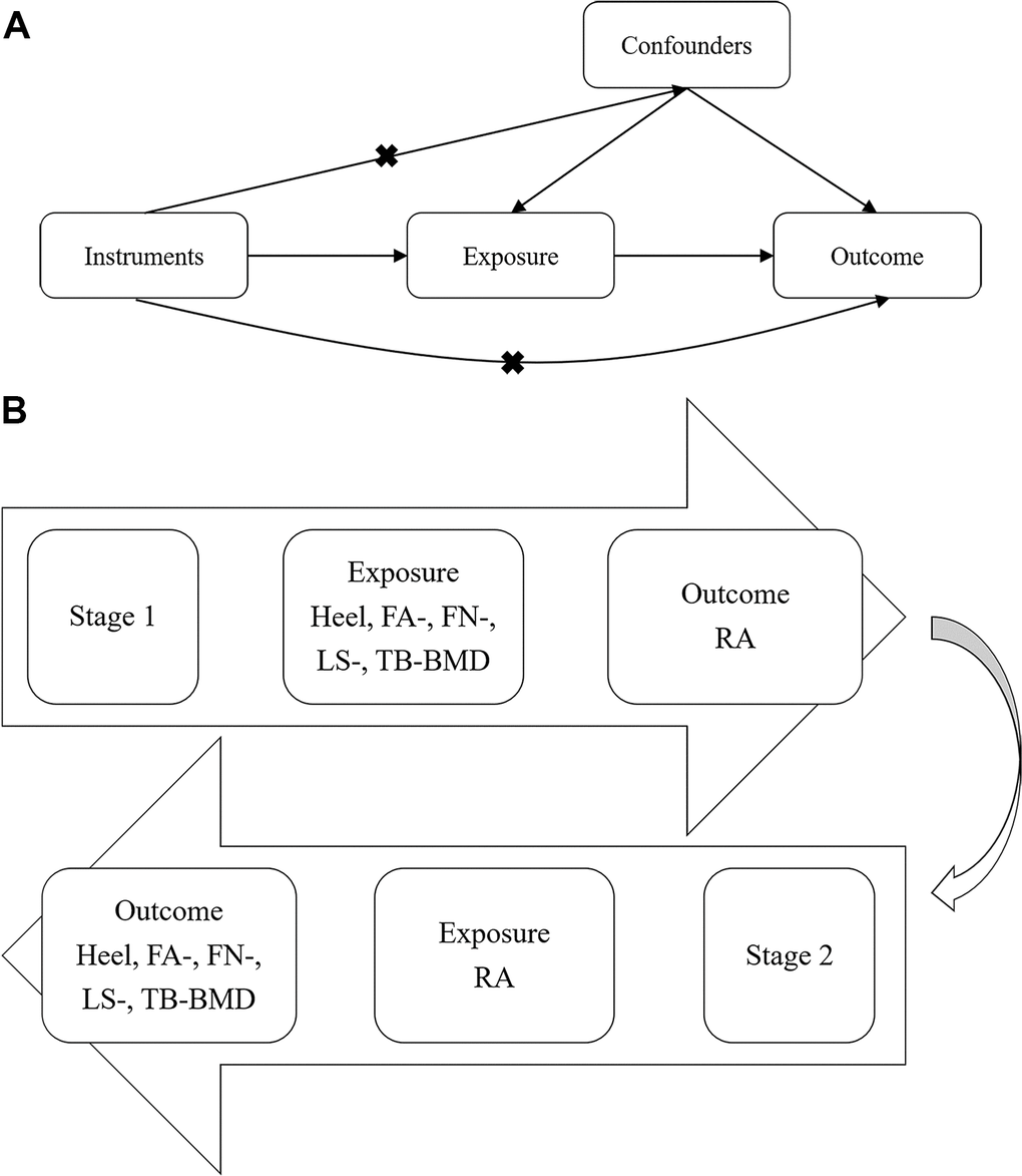 The bi-directional MR study design is shown in Figure 1B. In the first stage, we examined whether BMD measurements have causal effects on RA. In the second stage, we detected whether RA is causally associated with BMD measurements.