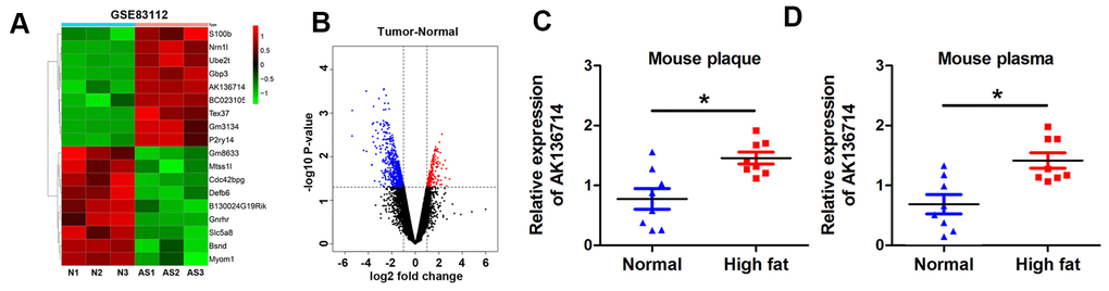 We first analyzed the differentially expressed lncRNA of mice on a normal diet and mice on a high-fat diet. By analyzing the GEO database, the change of lncRNA expression in atherosclerotic plaques was obtained in a mouse atherosclerosis model, and the heat map showed the expression of lncRNA in each group (Figure 1A). The volcano plot shows the gene distribution (Figure 1B). We found that AK136714 expression was increased in plaques in atherosclerotic mice compared to normal diet mice (Figure 1C). Upregulation of AK136714 expression was also detected in the blood of high-fat diet mice (Figure 1D).
