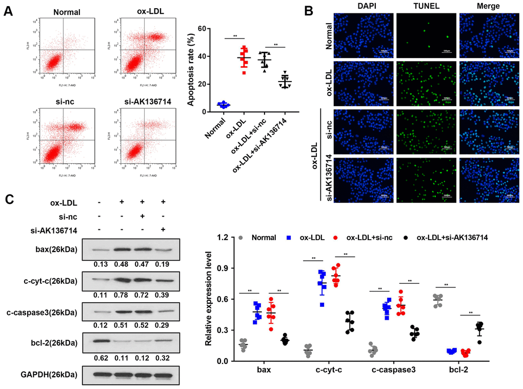 Flow cytometry was used to detect vascular endothelial cell apoptosis in ox-LDL-induced injury models. Compared with the control group, ox-LDL treatment increased endothelial cell apoptosis, and silencing AK136714 inhibited endothelial cell apoptosis (Figure 3A). The TUNEL results were consistent with those of flow cytometry (Figure 3B). Western blot was used to detect the expression of apoptosis-related proteins. Compared with the control group, the expression of apoptotic proteins Bax, cytoplasmic cyt-c, and cleaved caspase3 increased in high-fat diet mice, while the expression of anti-apoptotic protein Bcl-2 decreased. Silencing of AK136714 inhibited the expression of bax, cytoplasmic cyt-c, cleaved caspase3 while promoted that of bcl-2 (Figure 3C).