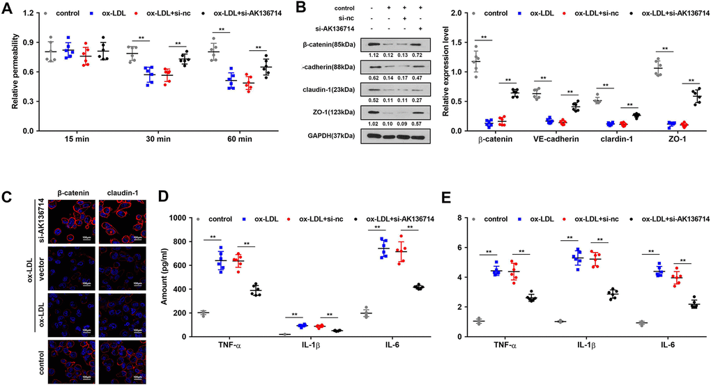 Endothelial cell permeability experiments show that ox-LDL induction inhibits endothelial cell function and decreases endothelial cell permeability, while silencing of AK136714 can restore endothelial cell permeability (Figure 4A). Western blot and immunofluorescence detected endothelium tight junctions-related protein expression. In endothelial cells, ox-LDL inhibited tight junction proteins such as β-catenin, VE-cadherin, claudin-1 and ZO-1, while silencing of AK136714 restored the expression of those tight junction proteins (Figure 4B). ELISA and qPCR showed that ox-LDL promoted endothelial inflammatory factor levels, and silencing of AK136714 inhibited endothelial inflammatory factor levels (Figure 4D, 4E).