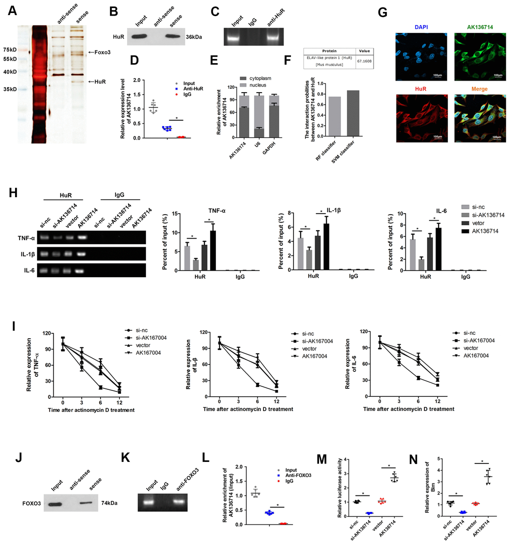 We used RNA pull-down, silver staining, and mass spectrometry to analyze the proteins that interacted with AK136714, FOXO3 and HuR (Figure 5A). RNA pull-down confirmed that AK136714 was able to bind HuR (Figure 5B). RIP experiments further verified that AK136714 was able to bind HuR (Figure 5C, 5D). We found that AK136714 was mainly expressed in the cytoplasm (Figure 5E). Bioinformatics analysis also correlated AK136714 with HuR (Figure 5F). Cell immunofluorescence colocalization experiments showed that AK136714 was able to colocalize with HuR (Figure 5G). After AK136714 overexpression or suppression, RIP assay was performed and RT-PCR was used to detect the expression of inflammatory factors (TNF-α, IL-1β and IL-16) in the product pulled down by anti-HuR antibody. AK136714 inhibition reduces the binding of HuR to inflammatory factors (Figure 5H).