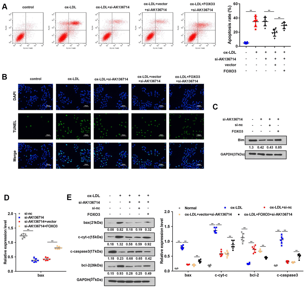 As Bim is a promoter of apoptosis, we investigated the effects of AK136714 and FOXO3 on endothelial cell apoptosis. Flow cytometry detection of apoptosis in each group showed that ox-LDL can induce apoptosis of endothelial cells, while silencing of AK136714 can inhibit endothelial cell apoptosis. FOXO3 can reverse the inhibitory effect of AK136714 (Figure 6A). The TUNEL results were consistent with those of flow cytometry (Figure 6B). Western blot showed that AK136714 silencing can inhibit the expression of Bim. FOXO3 overexpression reversed this effect of AK136714 (Figure 6C). qPCR results indicated that AK136714 knockdown inhibited the expression of Bax and FOXO3 can reverse this effect (Figure 6D). Western blot detection of the expression of apoptotic proteins in each group showed that ox-LDL increased the expression of apoptosis-related proteins Bax, c-cyt-c, and c-caspase3, while the expression of anti-apoptotic protein Bcl-2 decreased. Silencing of AK136714 inhibited the expression of Bax, c-cyt-c, c-caspase3, and promoted that of bcl-2. FOXO3 can reverse the anti-apoptotic effect of AK136714 knockdown (Figure 6E).
