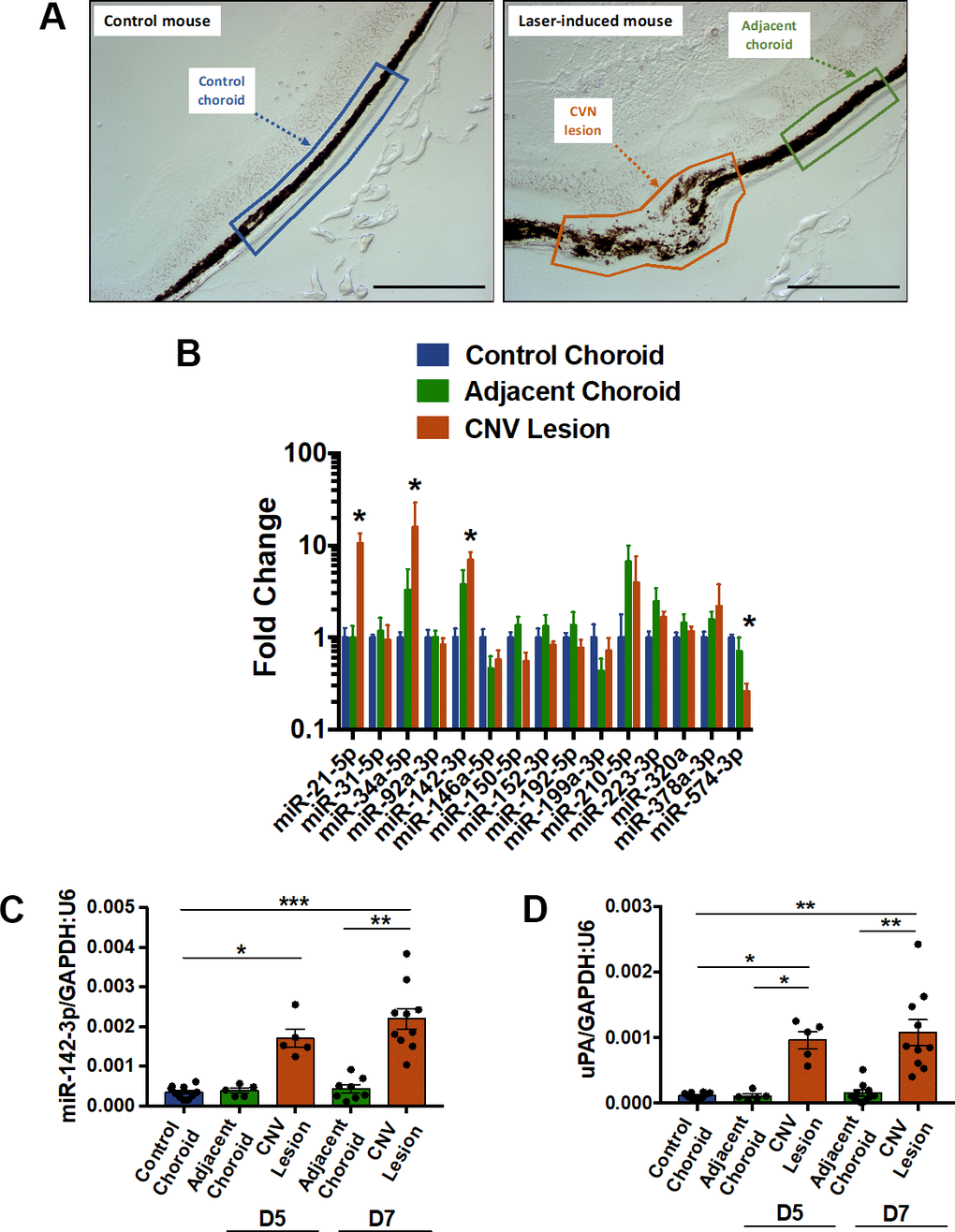 Laser microdissection was used to isolate three types of samples from mice subjected or not to laser-induced CNV: i) control choroid from control mice (not subjected to CNV induction), ii) CNV lesions, and iii) adjacent choroid (healthy choroid adjacent to CNV lesion) (Figure 1A). In a pilot experiment, the expression profile of 15 angiogenesis and/or inflammation-related microRNAs were determined 7 days post-induction by qRT-PCR in the 3 regions of interest (Figure 1B). Although probably not extensive enough, we focused our attention only on these 15 microRNAs i) because of limited RNA availability after laser microdissection and ii) because these microRNAs are reported angiogenesis and/or inflammation mediators. Among those microRNAs tested, only 4 were dysregulated: miR-21-5p, miR-34a-5p and miR-142-3p increased whereas miR-574-3p decreased upon laser-induction. To further confirm the overexpression of miR-142-3p in laser-induced CNV mouse, laser microdissection was repeated 7 days as well as 5 days post laser-induction. Interestingly, the miR-142-3p increased in the CNV lesions, both at days 5 and 7 post laser induction (Figure 1C), and correlated with the overexpression of uPA (urokinase plasminogen activator) used here as a CNV-disease marker [21] (Figure 1D and Supplementary Figure 1). Taken together, these data suggest that miR-142-3p could be of CNV progression in the laser-induced CNV mouse model.