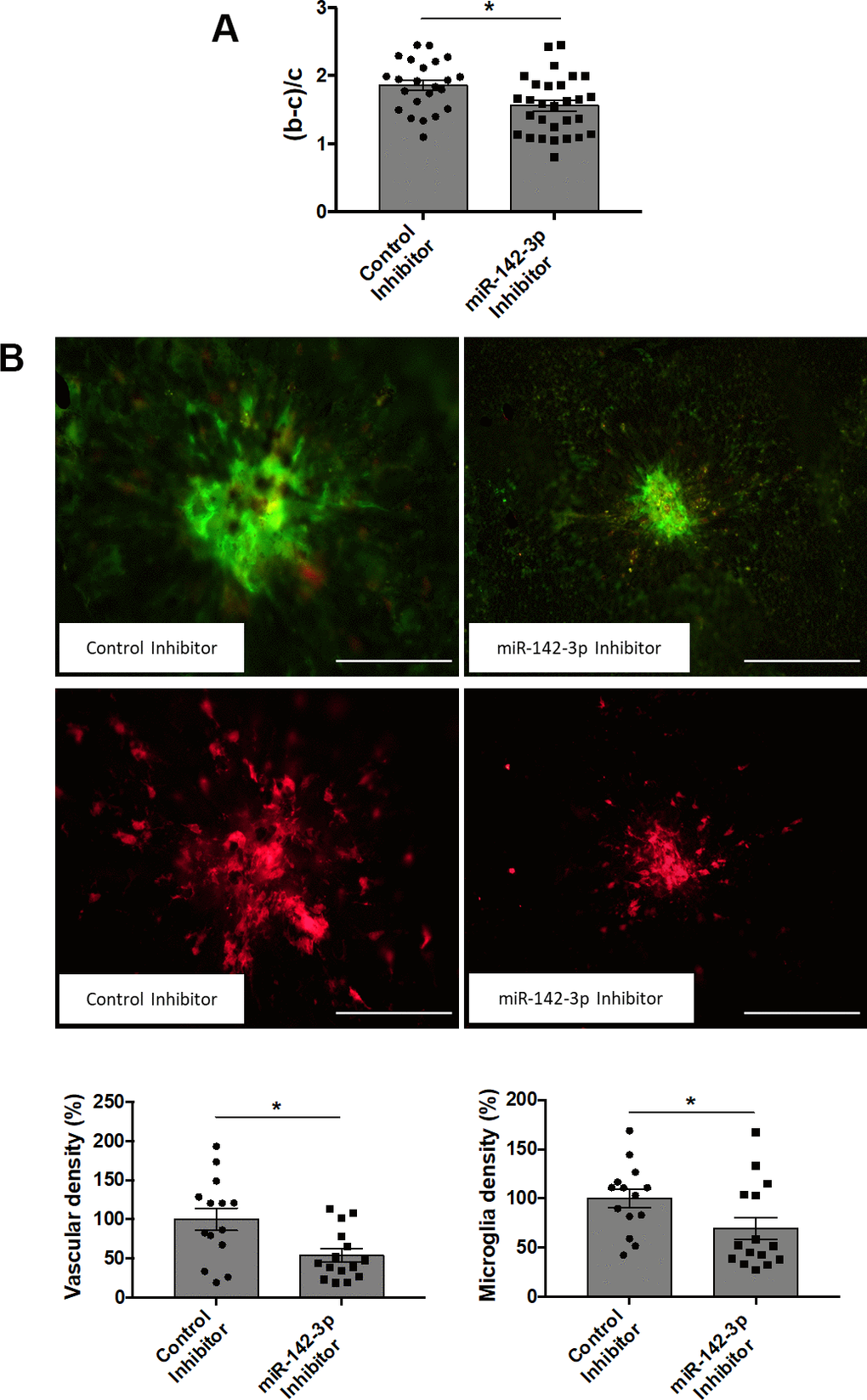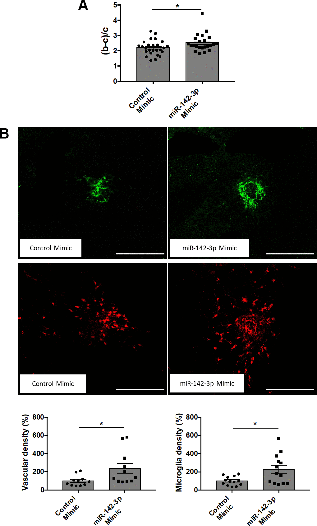 The present study unveils a functional role of miR-142-3p in stimulating CNV formation in a mouse model of wet AMD. This novel concept is supported by i) the overexpression of miR-142-3p in CNV lesions, and by ii) the impact of this miRNA modulation (inhibition/overexpression) on both vascular and inflammatory phenotypes. While inhibition of miR-142-3p caused a subsequent decrease of angiogenesis, its overexpression had the opposite effect. Beside its effect on angiogenesis, administration of miR-142-3p activates microglia cells -part of the inflammatory process- both in vivo and in vitro. Our data provide evidence for a pivotal role played by miR-142-3p during CNV progression and particularly on microglia activation.