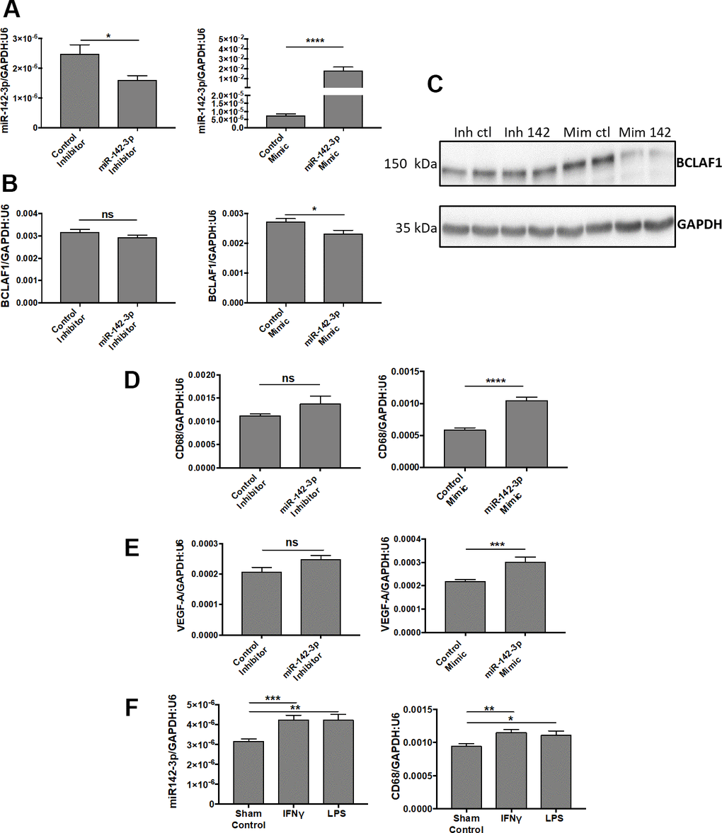 Transfection of human microglia HMC3 cells with miR-142-3p mimic drastically increased miR-142-3p expression (Figure 5A, right panel). It also decreased the production of its previously described target, BCLAF1, both at mRNA (Figure 5B, right panel) and protein (Figure 5C) levels [24]. BCLAF1 was used here to validate the efficacy of miR-142-3p mimic. Alongside with its effect on BCLAF1 expression, miR-142-3p overexpression also influenced HMC3 activation state as assessed by increased CD68 level (Figure 5D, right panel), a marker of microglia activation [25, 26]. Interestingly, VEGF-A transcript level (Figure 5E, right panel) increased upon miR-142-3p mimic, which could contribute to the effect observed in vivo on the angiogenic response. When using the inhibitor, only a slight decrease of miR-142-3p expression was observed (Figure 5A, left panel) without any effect on BCLAF1, CD68 and VEGF-A levels (Figure 5B–5E, left panels). Such a low effect of the inhibitor may be related to the low basal level of miR-142-3p in HMC3 cell line.
