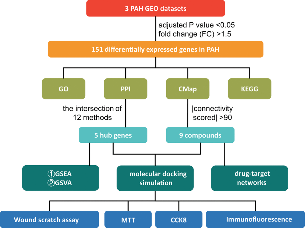 Regarding PAH treatment, to develop a novel drug requires substantial costs and a lengthy process of ensuring its safety and tolerance in the human body [10, 11]. By contrast, repurposing a non-novel drug with precise and new mode of action is relatively more cost-efficient and time-saving. Recently, an increasing number of free databases and online tools have been developed, which could help our repositioning of known drugs. For example, the Connectivity map (CMap; https://clue.io/) database serves as a potentially useful tool for drug screening that can predict molecular targeted agents based on DEGs [12]. Combined with high-throughput data, it facilitates the repurposing of known drugs which has passed the toxicology and dosage analyses. Recently, a study reanalysed CMap whole-genome transcriptome data by combining 26 similarity scores with 6 different heuristics. It provided an insight to find a known drug by comparing the effects on the transcriptomes [13]. Then, molecular docking simulation and in vitro experiments can be performed to verify the prediction results.