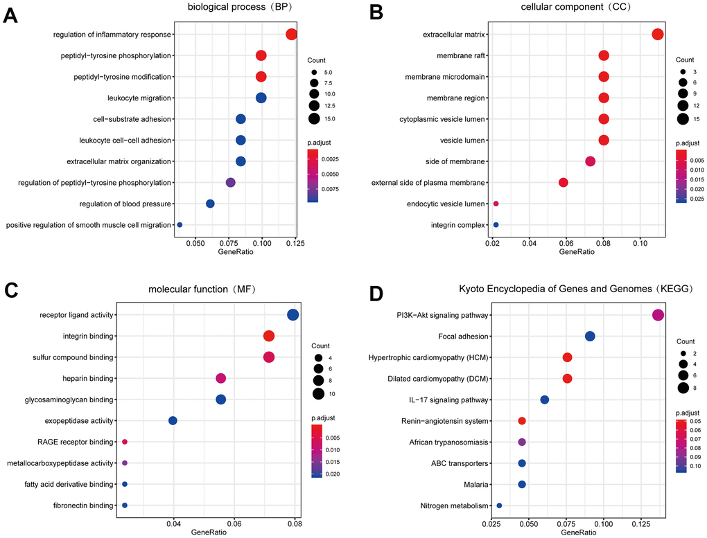 We carried out GO enrichment analysis on DEGs with the help of “clusterprofiler” package to explore their biological features [19]. Biological process (BP) terms showed that the DEGs were enriched in “regulation of inflammatory response”, “peptidyl-tyrosine phosphorylation” and “peptidyl-tyrosine modification” (Figure 3A), suggesting that the inflammatory response might play an important role in the development of PAH. In terms of cellular component (CC), the terms “extracellular matrix”, “membrane raft” and “membrane microdomain” were significantly enriched (Figure 3B). Therefore, we hypothesized that the DEGs mainly played roles in the extracellular matrix. The major enriched molecular function (MF) terms of the DEGs were “receptor ligand activity”, “integrin binding” and “sulfur compound binding” (Figure 3C).