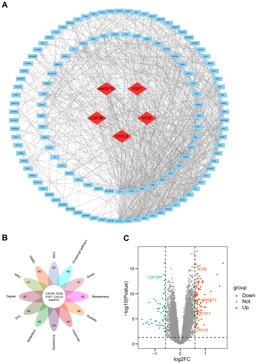 To find the hub genes, a PPI network was constructed with Search Tool for the Retrieval of Interacting Genes (STRING; https://string-db.org/) [20], and a total of 128 nodes and 858 edges were in the PPI network (Figure 4A). Next, we took advantage of Cytoscape's plug-in “Cytohubba” to explore the PPI network. To have a more credible result, all 12 algorithms were utilized to calculate the degree of connectivity of DEGs. We selected top 40 genes in each algorithm (As many genes scored equally in the MNC, Stress, BottleNeck, and EcCentricity algorithms, the number of obtained candidate genes was over 40 (Supplementary Table 3)). Then we intersected the results of 12 algorithms. Finally, five hub genes (CSF3R, NT5E, ANGPT2, FGF7, and CXCL9) were obtained (Figure 4B and Supplementary Table 4). The five hub genes are labelled in the volcano plot to show their expression levels (Figure 4C).