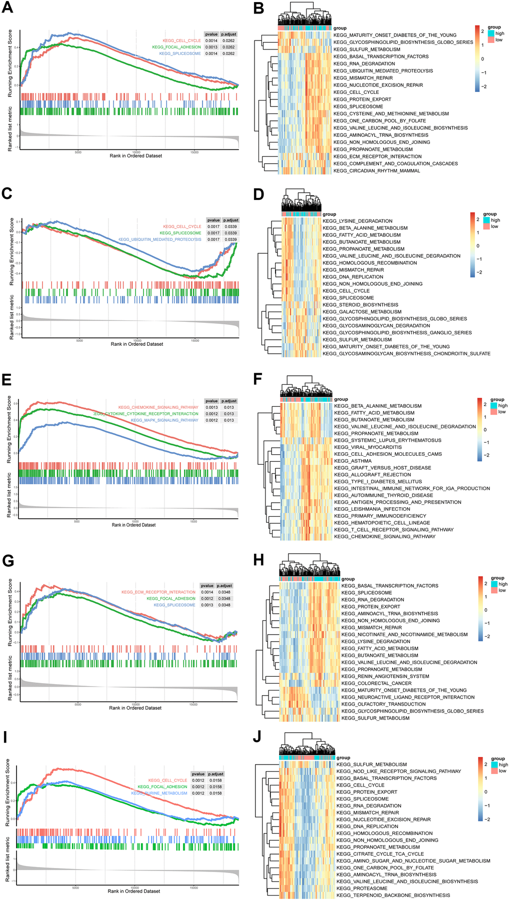 To further reveal the potential function of the five hub genes, GSEA was performed based on each single hub gene (Figures 5A, 5C, 5E, 5G, 5I). The NT5E, CSF3R and ANGPT2 groups were enriched in the spliceosome pathway. Meanwhile, the cell cycle was enriched in FGF7, ANGPT2 and CSF3R groups, whereas focal adhesion was enriched in the FGF7, ANGPT2 and NT5E groups. The other enriched items were specific to single groups. For example, the chemokine signalling pathway, purine metabolism, cytokine-cytokine receptor interaction and the MAPK signalling pathway were enriched in a group of CXCL9. Most of the pathways were closely associated with cell proliferation.