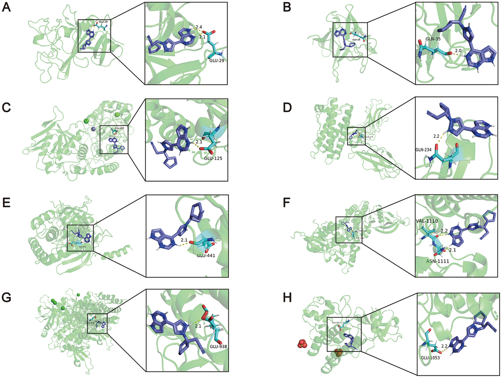 Furthermore, molecular docking simulation was utilized to delve into the possible therapeutic mechanisms of these drugs. Five hub genes were supposed to serve as potential therapeutic targets in PAH. Among the nine compounds, lypressin ranked first, but its 3D structure was not provided on ZINC (http://zinc.docking.org/) [22]. In addition, ruxolitinib, described as a Janus-associated kinase (JAK) inhibitor in the CMap database, obtained the second highest score (97.86). Activation of the JAK-STAT signalling pathway has been reported to induce the transcription of pro-angiogenesis and pro-inflammatory genes, leading to the progression of PAH [23]. Consequently, ruxolitinib was selected to dock with the proteins encoded by hub genes. We downloaded the 3D structures of NT5E (PDB: 4H2F), ANGPT2 (PDB: 4JZC), FGF7 (PDB: 1QQL), CSF3R (PDB: 2D9Q) and ruxolitinib to perform the molecular docking simulations, whereas the 3D structure of CXCL9 was not provided on RCSB PDB (https://www.rcsb.org/) [24]. In addition, JAK1 (PDB: 4GS0), JAK2 (PDB: 2B7A), JAK3 (PDB: 3ZC6) and TYK2 (PDB: 4GFO) as known targets of ruxolitinib served as positive controls. The binding energies between ruxolitinib and ANGPT2, FGF7, NT5E, CSF3R, JAK1, JAK2, JAK3, TYK2 were -6.42, -5.25, -6.30, -3.69, -3.59, -3.65, -3.90, -4.73 kcal/mol, respectively (Figure 6). It indicated that ANGPT2, FGF7 and NT5E may be the targets of ruxolitinib in treatment of PAH (The binding energies of these 3 proteins were higher than the positive controls). Other details of the results, such as the hydrogen bond, atomic distance and binding site data, are shown in Figure 6. From the above findings, ruxolitinib may have an unexpected effect in the treatment of PAH.